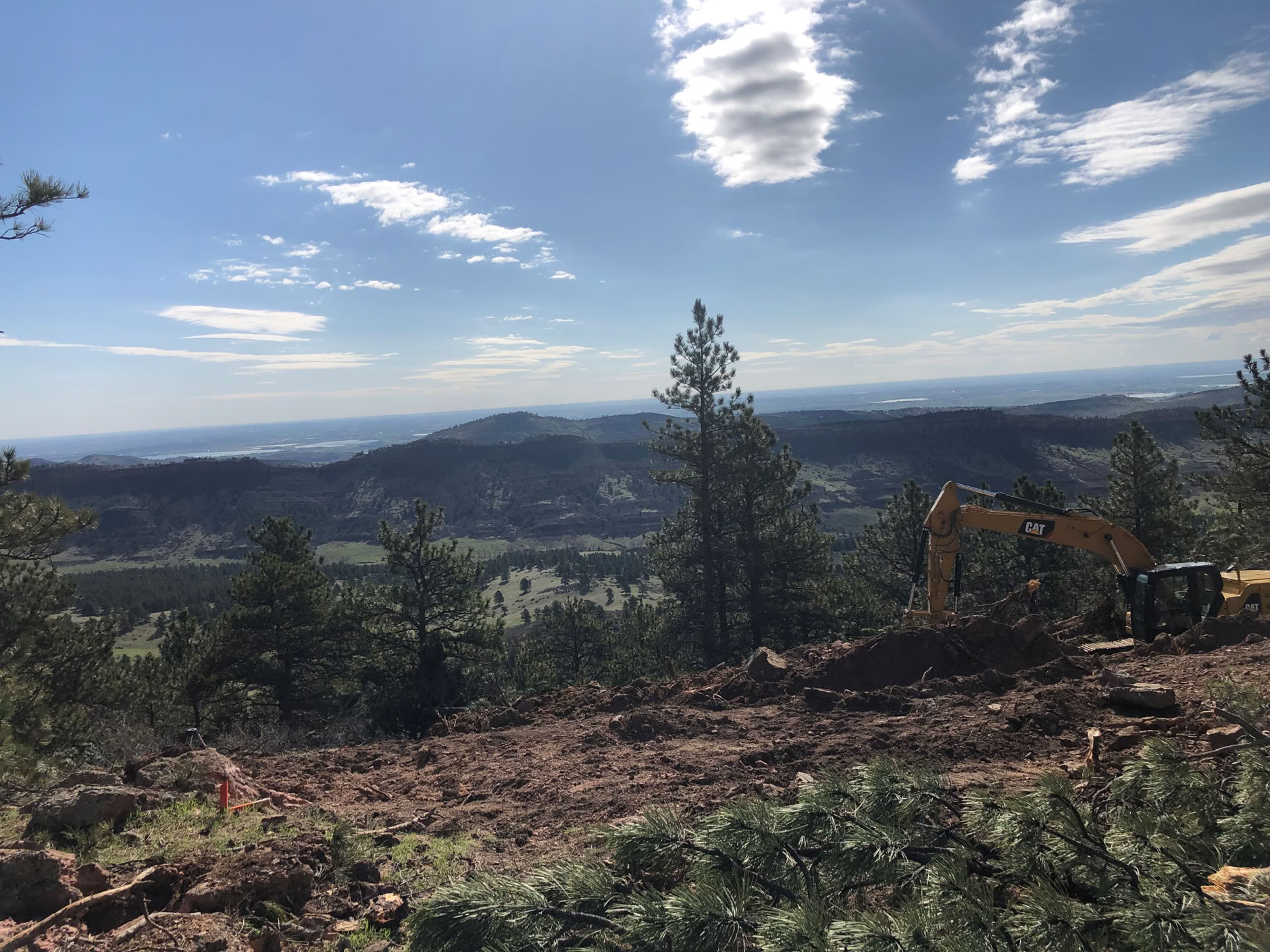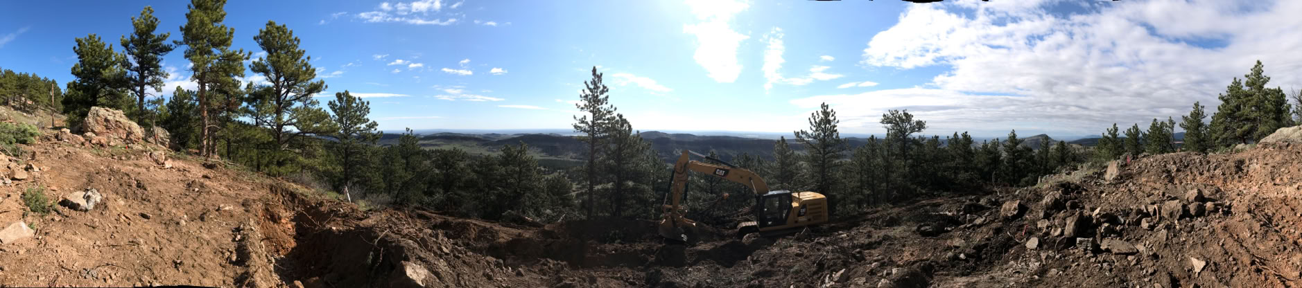 Enough of the trees are down so that we can evaluate the views! Wow! They’re even better than we’d hoped for! When the topographic maps say that the site is at least 300’ above the hogback to the east, it’s difficult to really get a feel for what that means, when all you can see thru the trees is a few scattered glimpses of the hogback itself and even fewer bits of the eastern plains could be seen.