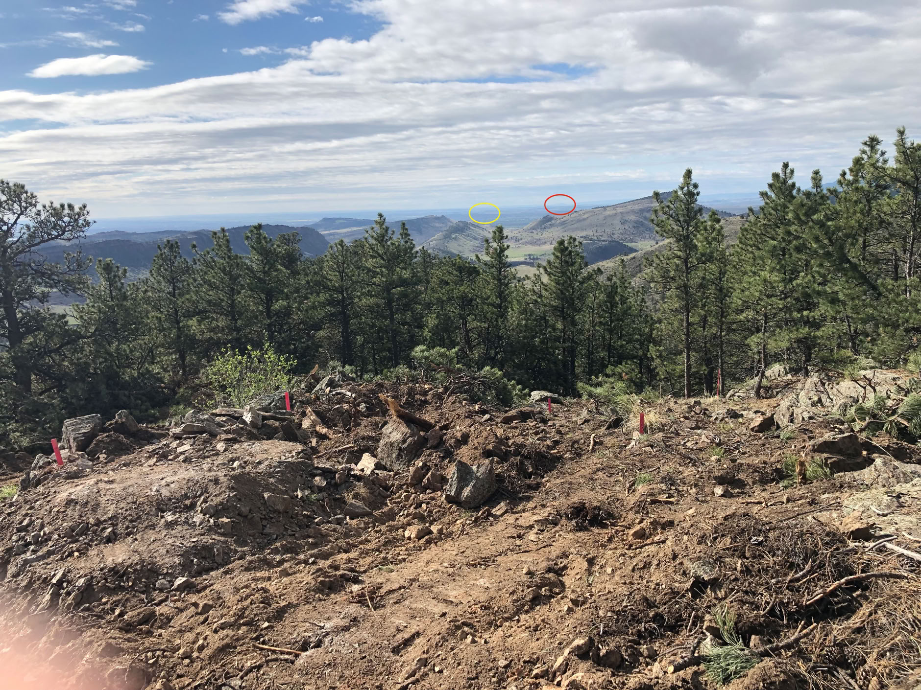 Looking just a bit east of south. The red oval is Pike’s peak, the yellow is LoDo (Downtown Denver) This is where the difference between a true camera and the iPhone shows up. I’ll shoot this again with a big telephoto lens and you’ll really be able to see Pikes peak and the downtown skyscrapers.