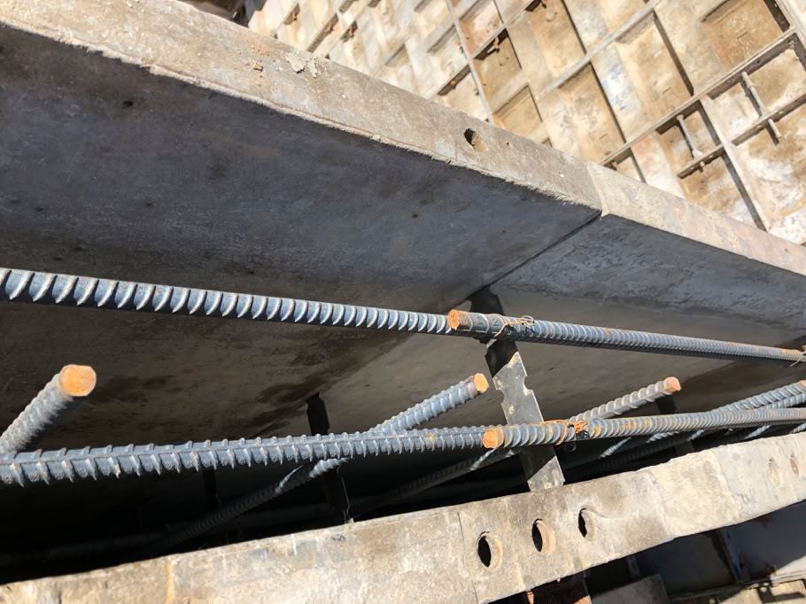 A look inside one of the forms. There’s a lot of steel in there! That’s all number 5 rebar. The vertical rebar is tied to the “Ls” that were placed into the footers. The straps that hold the forms together at exactly 8” also hold the horizontal rebar at the spacing called for by the structural engineer.
