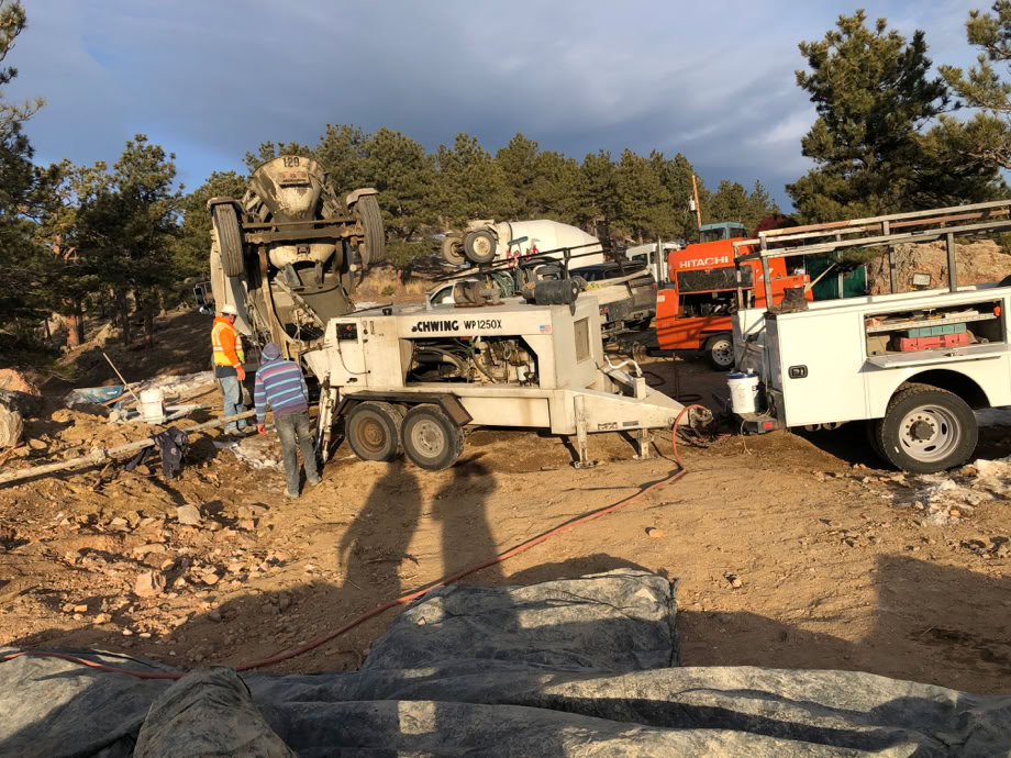 Here’s what it takes to support the shotcreting operation. The Schwing Wp 1250X is a small concrete pump. The red trailer in front of the Hitachi excavator is a large air compressor and there is one concrete truck emptying into the pump with a second waiting.