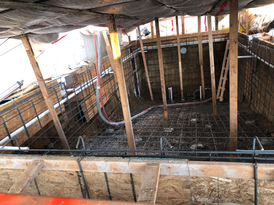 Here’s a look under the cover. Everything is ready to go - rebar, plumbing and skimmers are installed. The 2 x 4s that hold up the temporary cover will be picked up as the shotcrete sets and placed on plywood spreaders.