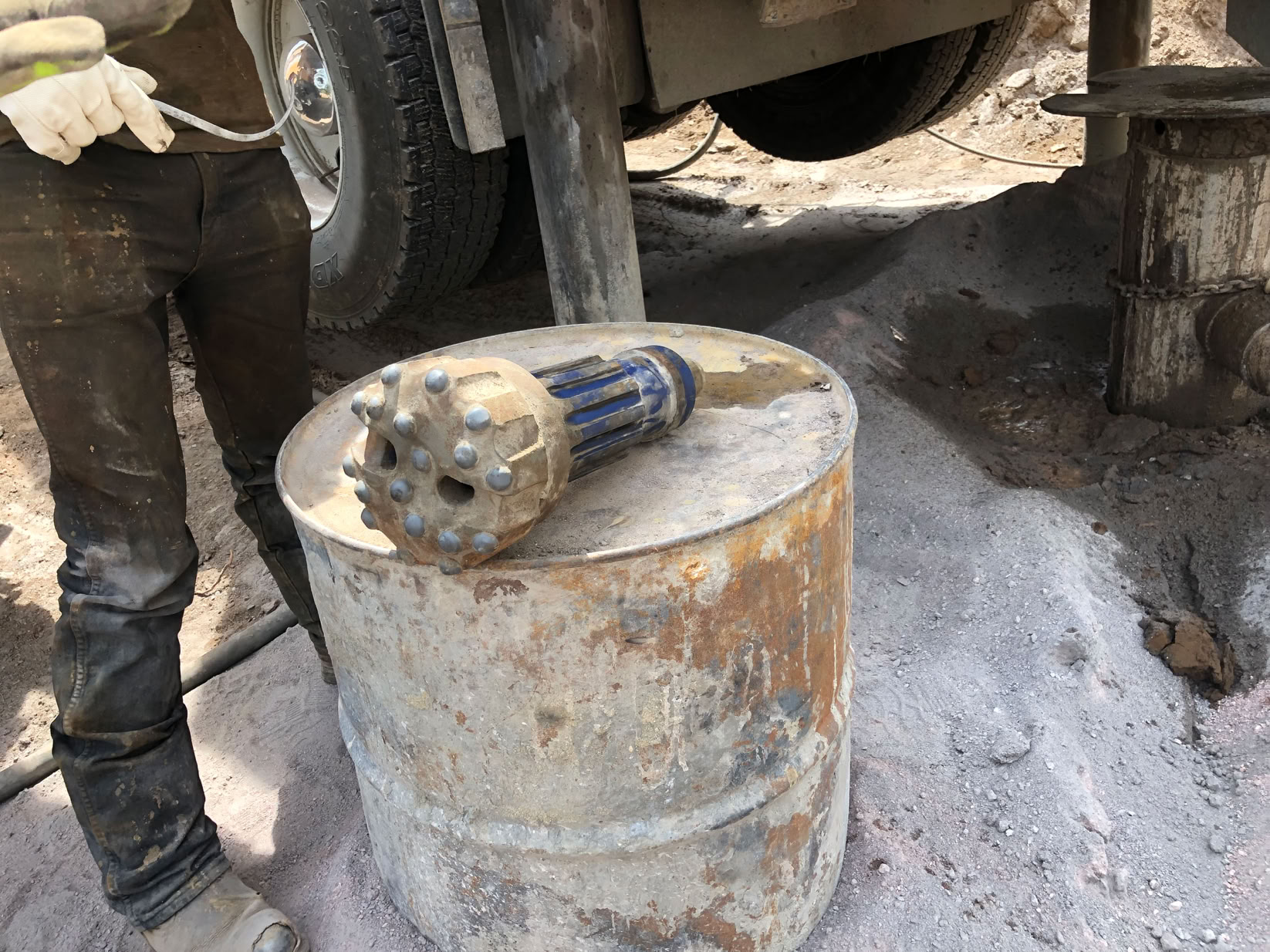 Yes, it was Monday. Here you can see the broken bit of plastic that required the drillers to “make a trip” up from about 600’. That tiny little bit of white plastic is the seal between the hammer and the bit. With that broken, the air wasn’t going to the bottom of the hole to pick up the broken rock.
