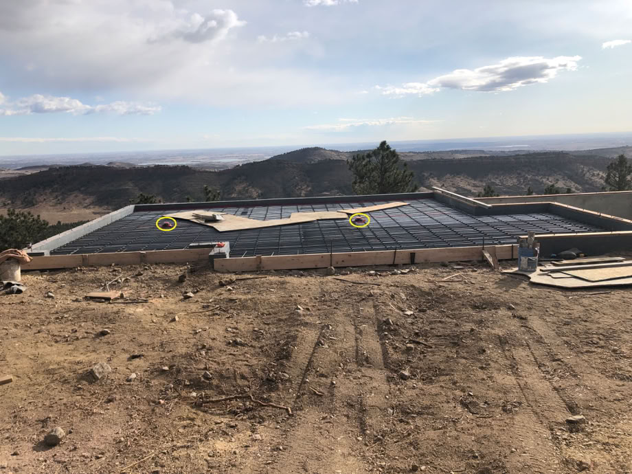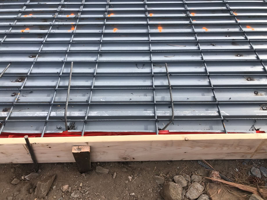 This is where one of the garage doors will be. You can see the rebar from the reinforced concrete wall has been bent down and tied to the garage slabs rebar mesh. That board’s top has been placed exactly at the top of the slab. The red tape is sealing the steel deck to the perimeter wall.
