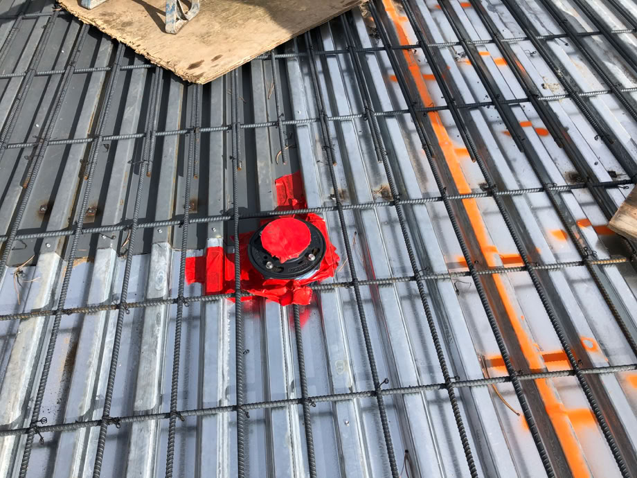 Here’s the right hand drain up close. As you can see, it’s base is pretty big. The rebar is spaced at 6” north to south, 18” east to west. It doesn’t sit on rebar chairs, the steel decking’s ridges perform that function. This picture is shot from the south of the drain looking north, so it’s at 90° from the overall shot. The red plastic on top keeps the concrete out during the pour. The red tape on the steel deck seals the penetration so the concrete doesn’t go thru it.