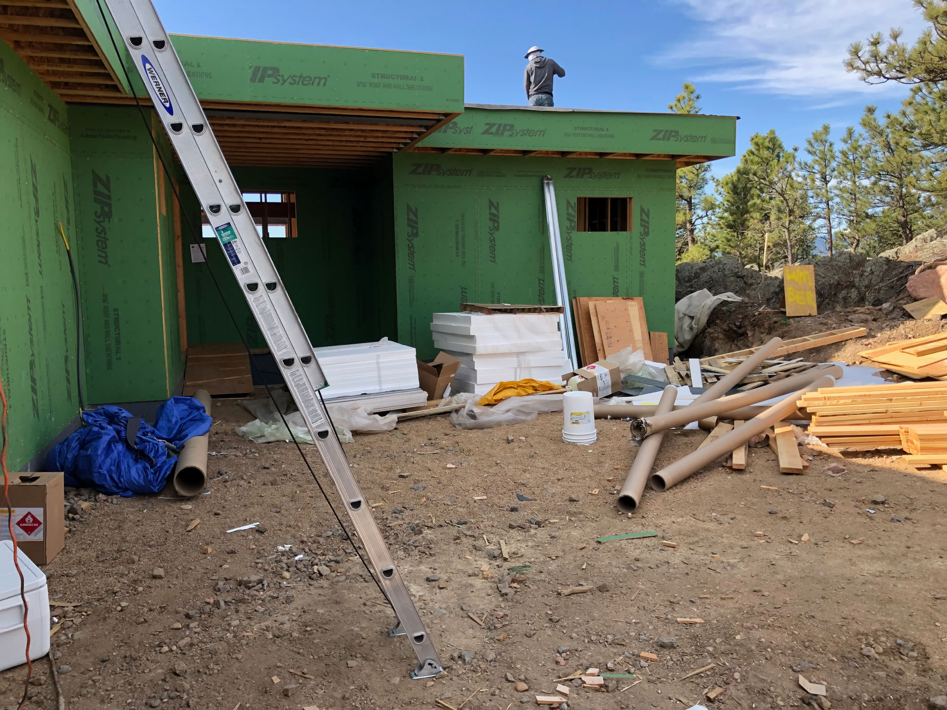 We didn’t get any good shots of the roof actually being put on because it only took a couple of days. The flat sections of the roof actually aren’t perfectly flat. The styrofoam insulation on top of the ZIP system sheathing is cut at various slopes so the roof drains properly. Then the membrane is placed on top of that and glued down.