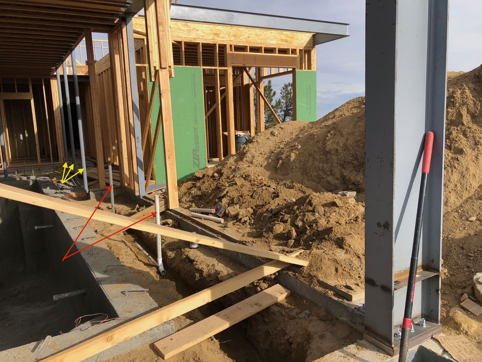 Here you can see the permanent steel posts (pointed to by yellow arrows again) and the two risers (pointed to by red) that connect the perimeter drain in the deck to the drain to daylight pipes.