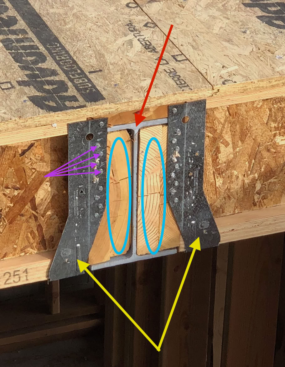 This detail is from the north end of the stair well. It shows the end of a W10 x 22 steel beam (pointed to by red arrow) with the 2 x 10 nailers (blue ovals) and joist hangers (pointed to by yellow arrows) fastened by a tight zig-zag of nails (purple arrows) .