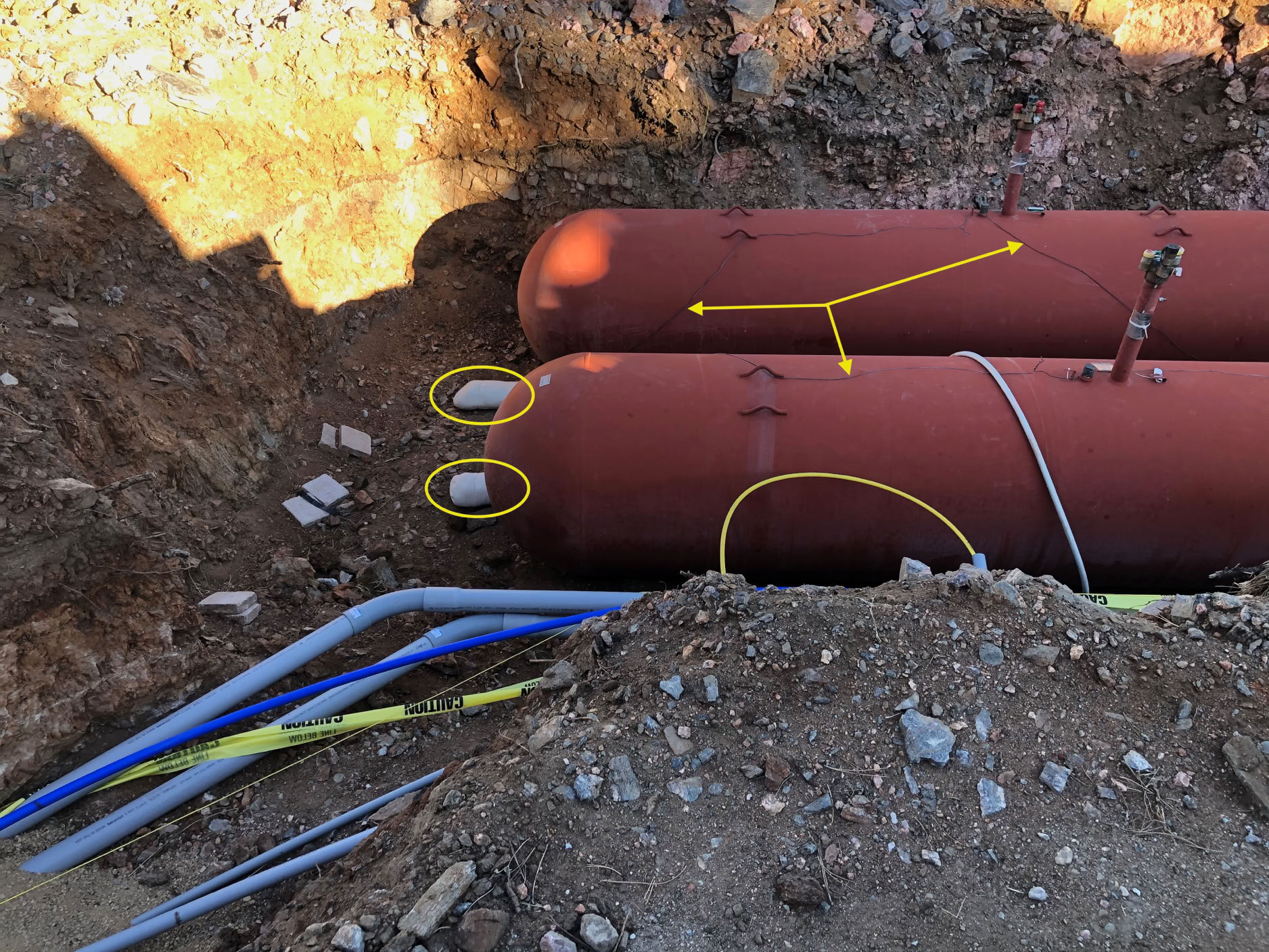 This was actually taken at the previous, very brief onsite on January 8, 2020. Here we can see the propane tanks wired up to their anodes with the thin black wires. The anode metal is in the white cloth bags in the yellow ovals, the wires are pointed to by the yellow arrows.