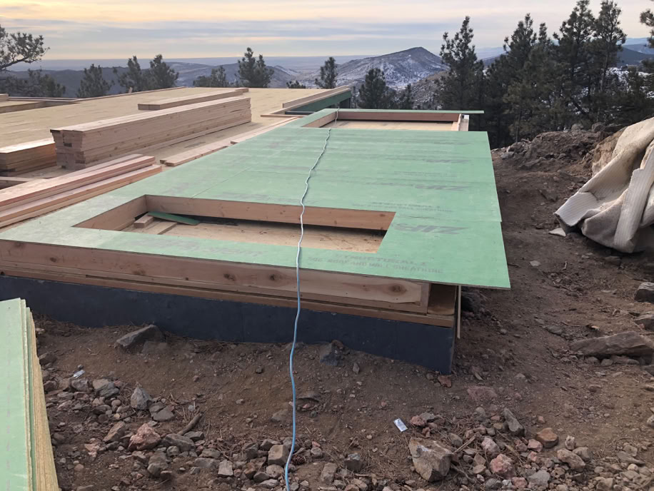 The Office, Entry Way and Mudroom walls. This also shows one reason for the weekly on-site meetings. We spotted that the office north and south windows weren’t floor to ceiling! They’ll be corrected at little cost, since the mistake was spotted so soon.