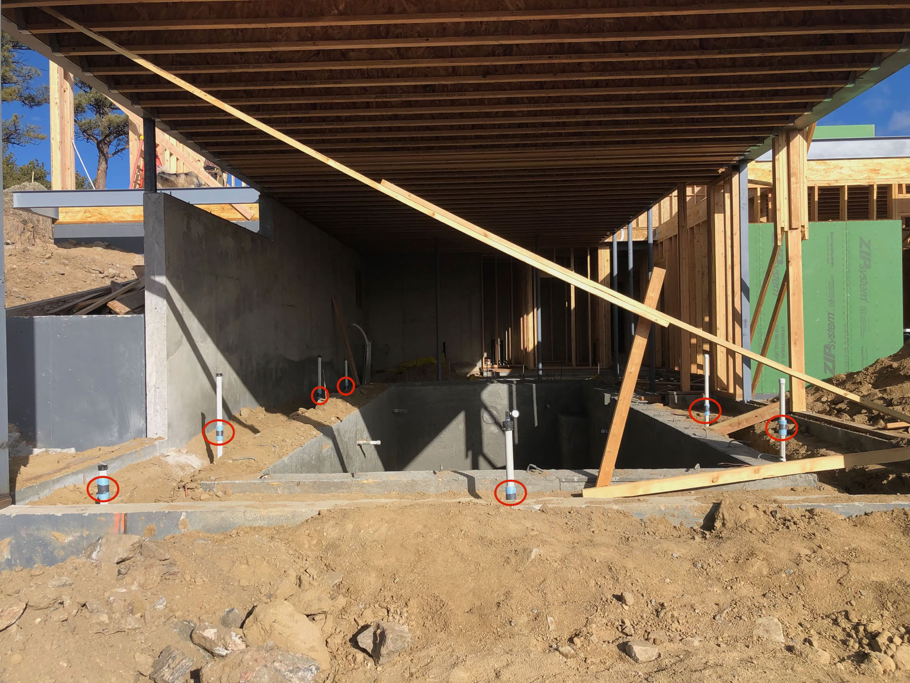 These red ovals show where the pool perimeter drains will penetrate the concrete floor. To give some flexibility to the system, the pipes are wrapped in the blue closed cell foam, which is held in place by the black tape.