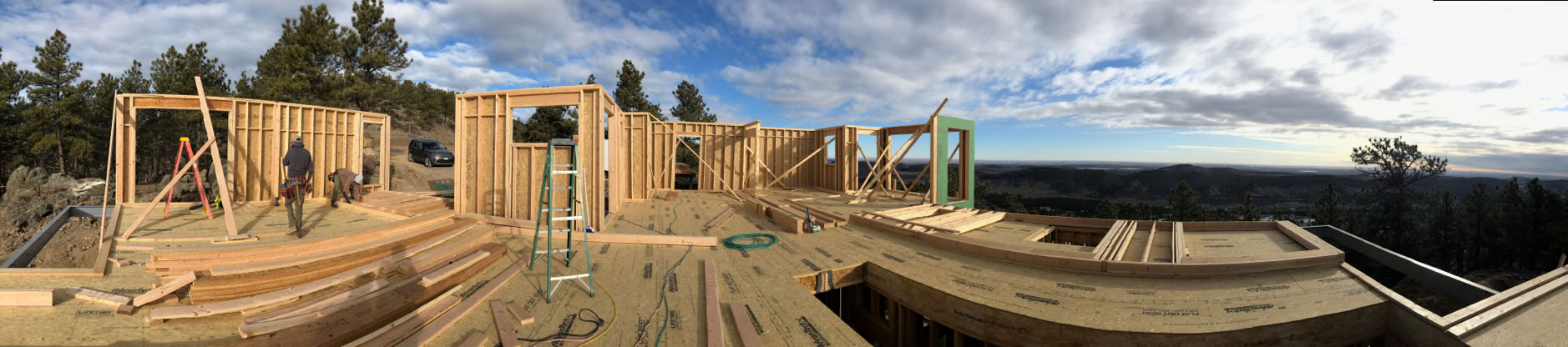 Bill shot this panorama from near the south end of the stairway opening, hence the extreme distortion of said opening. At the far left (west) you can see the west wall of the west master suite is up. Directly behind the step ladder is the north wall of the entry, then to the right of that the south wall of the garage and then to the right of that, the office. Note that the north and south windows of the office have been corrected and that they now have floor to ceiling windows in them.
