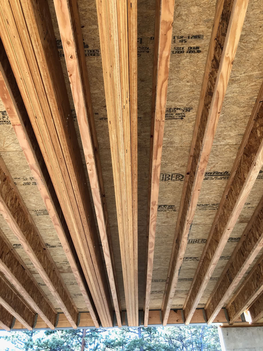 The upper level floor underneath the fireplace gets two sets of quadrupled up micro lam beams. This would allow the fireplace and chimney structure to weigh up to 3,000 lbs. It’s actually going to be a lot less, since it’s not masonry.