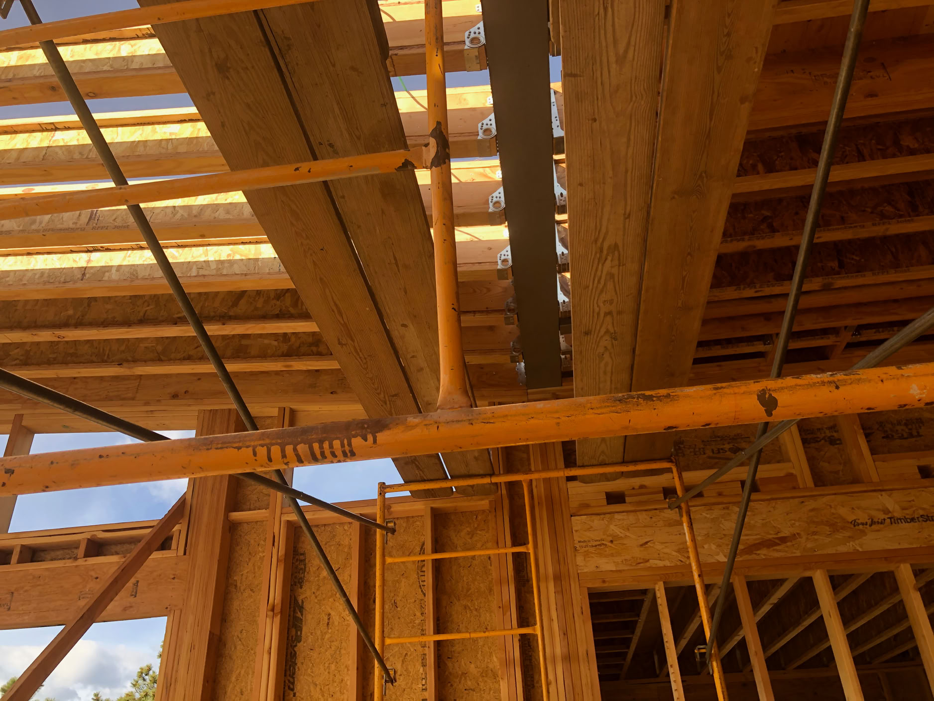 Here you can see how those Simpson slopeable/skewable rafter hangers work. The big holes at the bottom of their sides are the hinge that allows the rafters to be placed at any slope relative to the steel beams they’re fastened to. The normal hangers on the right side of the steel beam only allow the joists to be hung exactly perpendicular to the beam.
