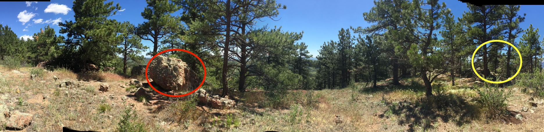 This was shot a bit farther south and east than the original. The rock has a pile of special material at it’s base and many trees have been removed. Believe it or not, the trees circled in yellow are the same ones as the 1st panorama.