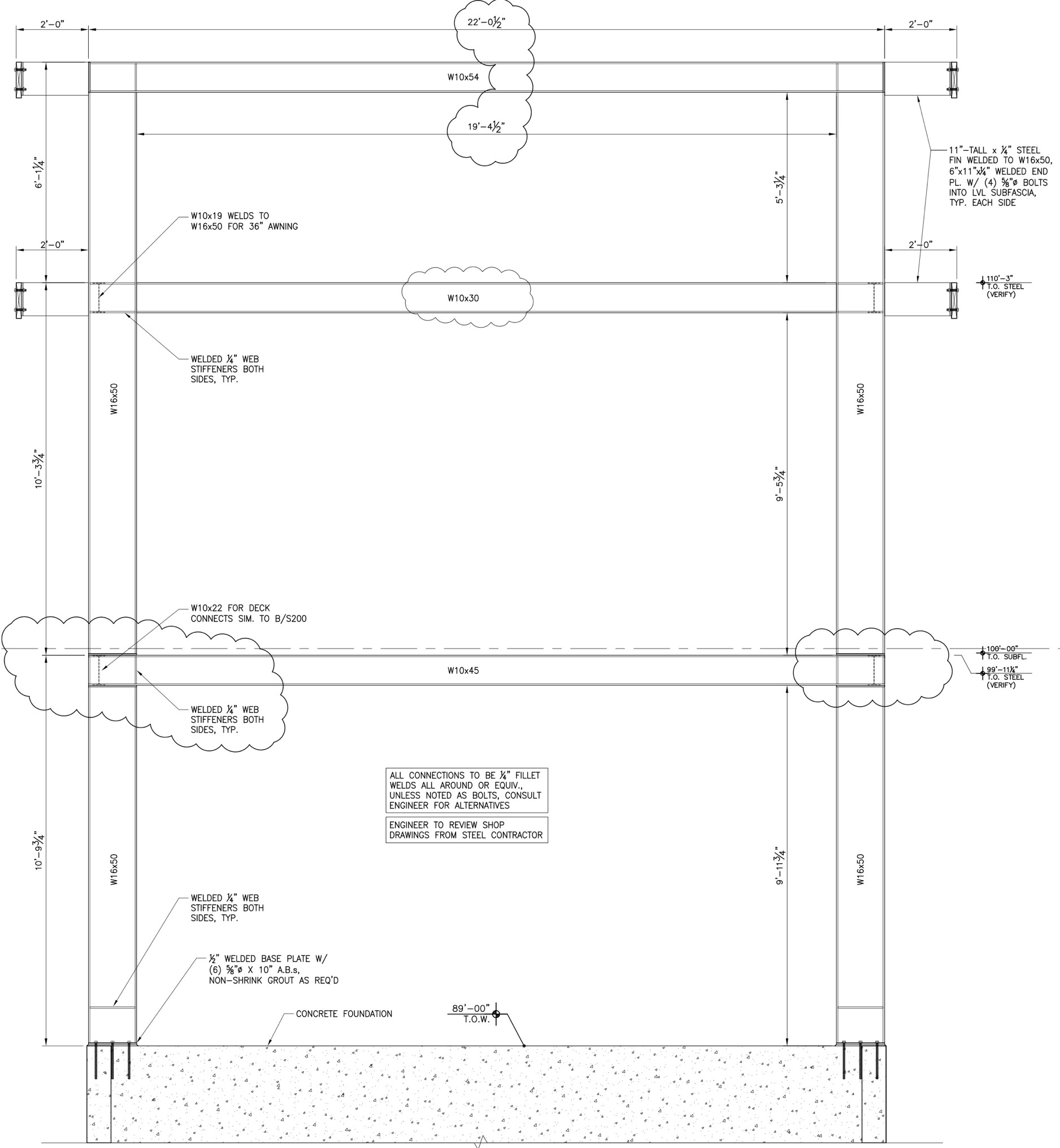 The two vertical W16 x 50 beams are the largest in the house! At 27’ 2¾’ they weigh about 1350 pounds each. (After the 12/19/2019 placement, I realized that these are in two pieces, upper and lower) To insure that the main floor won’t flex a W10 X 45 is used. The beam that carries the sunshade is a lighter W10 X 30, since it doesn’t have to meet the exacting deflection requirements of the sliding wall. Finally, the roof can see considerable snow load so it’s supported by a W10 X 54 that comes in at about 1,200 pounds.