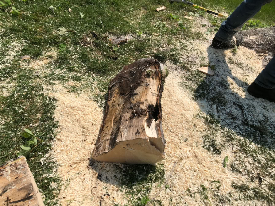 The section that’s being rolled is the very bottom most section that the arborists could safely cut. If you go any lower, you risk hitting rocks that the tree grew around. You can see that the split goes all the way thru this section.