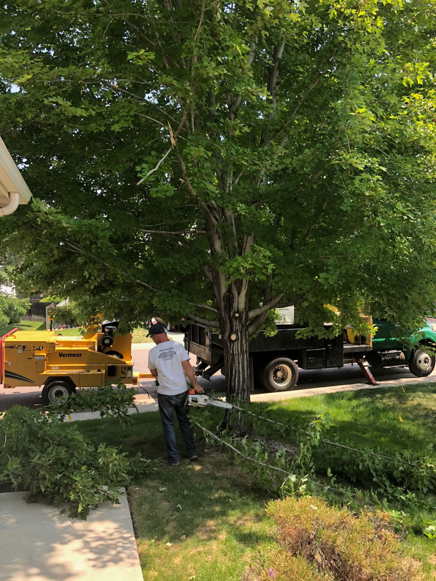 The big day! The crew arrived about 1:00 pm and got started immediately! Almost as soon as the truck was parked there were two people with chain saws lopping off the limbs that could be reached from the ground and the chipper was running almost as soon as the chains saws were.