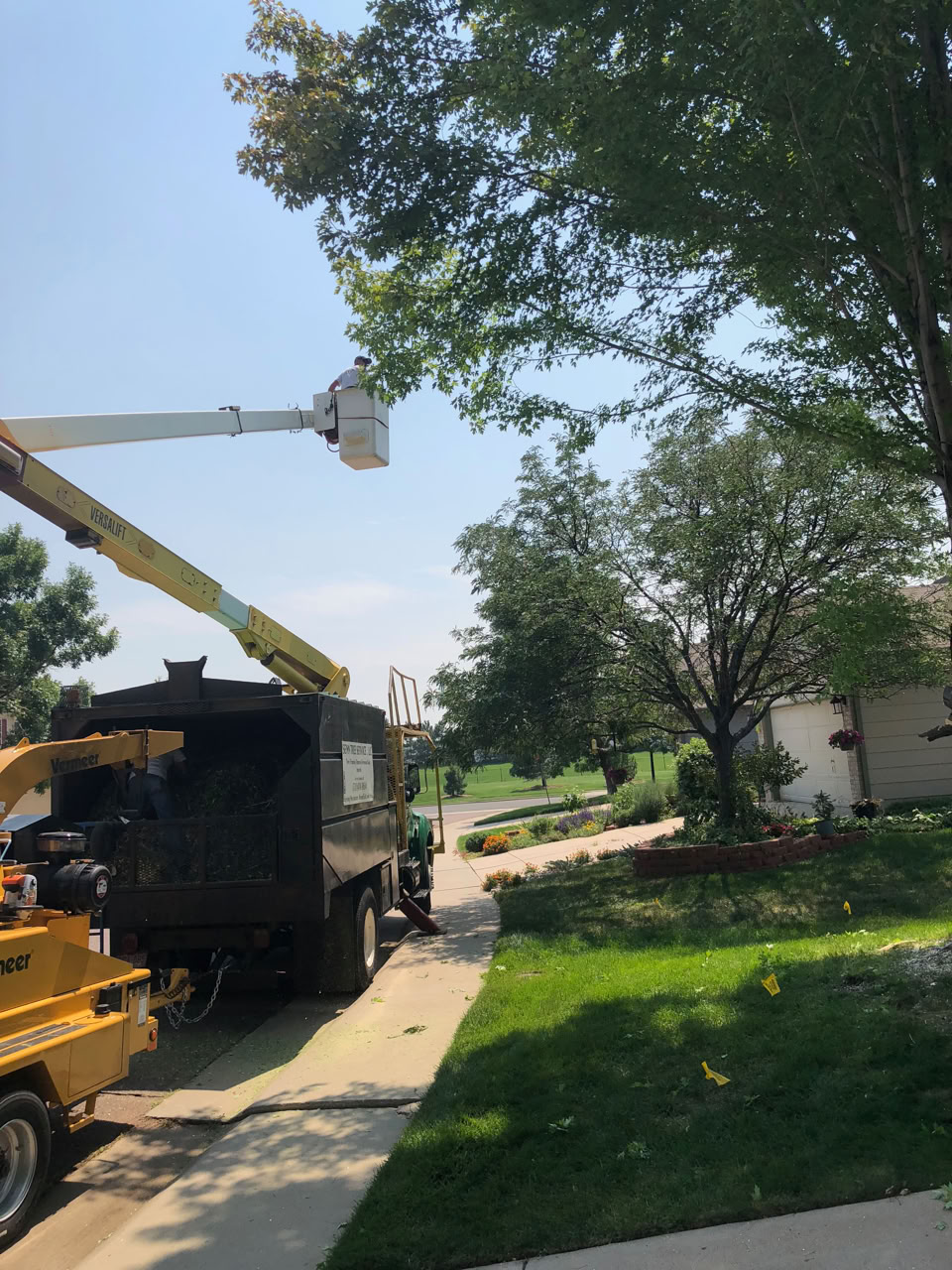 Having to shoot from the porch involved deciding which side of the pesky corner post to shoot at. As you can see, it gets pretty hectic in the work area! The Vermeer really puts out a lot of chips when it gets busy.