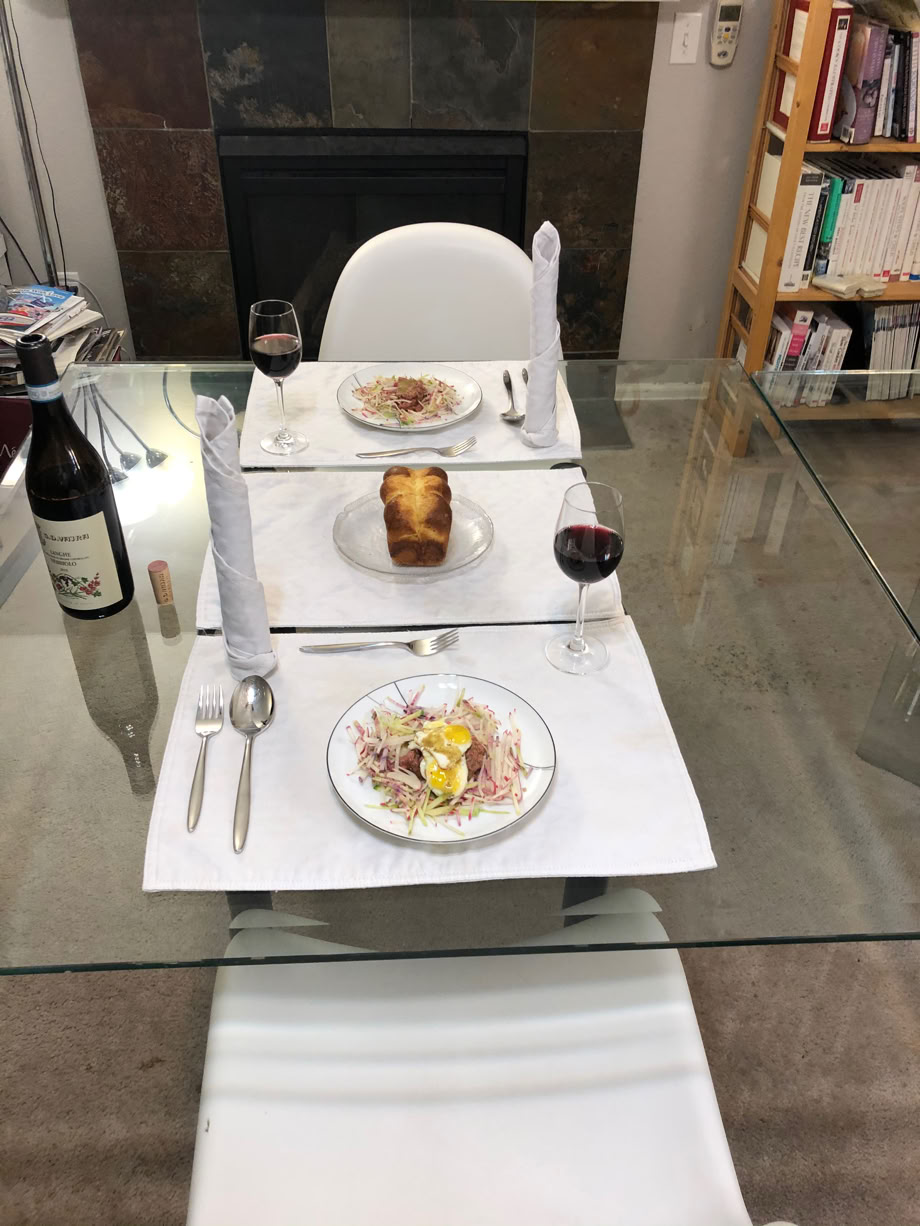 Here’s the table before the 1st course. You can see part of our cookbook collection at the right. This dinner’s courses only needed a single utensil each, the small fork for the 1st course, the large spoon for the 2nd and the small fork at the top of the napkin for the 3rd, dessert course.