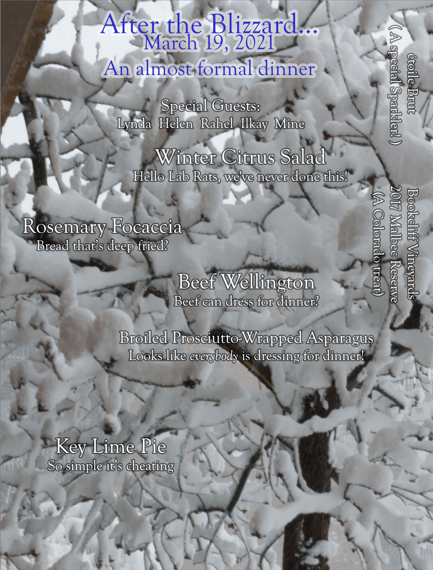 Now for something really different. From time to time we do special dinners for our friends. The occasion was Lynda had some guests from out of town and we’d just had the 4th largest snow storm in Denver’s recorded history, so we did the After the Blizzard dinner. These dinners are complicated, so two pages are needed. This is the ahead of time preps and the 2nd page is the final cooking at Lynda’s house.