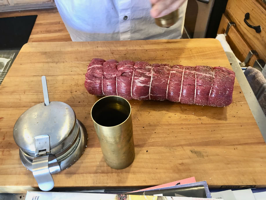 The very beginning of the beef Wellington, Wally’s wonderful beef tenderloin, crafted into the perfect shape! We left it tied, so the dish would be much easier to prepare. In an amazing coincidence, both Cuisine at Home and Cook’s Illustrated’s December 2020 issues had Beef Wellington in them. We combined Cuisine at Home’s mushroom duxelles and use of frozen puff pastry with Cook’s Illustrated’s technique of “pull it out of the oven way too early at only 85 °F in the center and let it coast up”