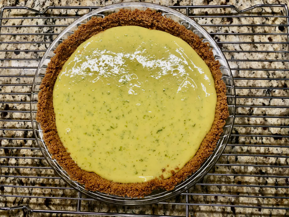 We started with dessert, Key Lime Pie. We use the Coook’s Illustrated, simplest possible Key Lime Pie. The crust is just Graham crackers, sugar and butter. The filling is just 4 ingredients, lime zest, lime juice, sweetened condensed milk and egg yolks. This is the pre-baked crust, cooling.