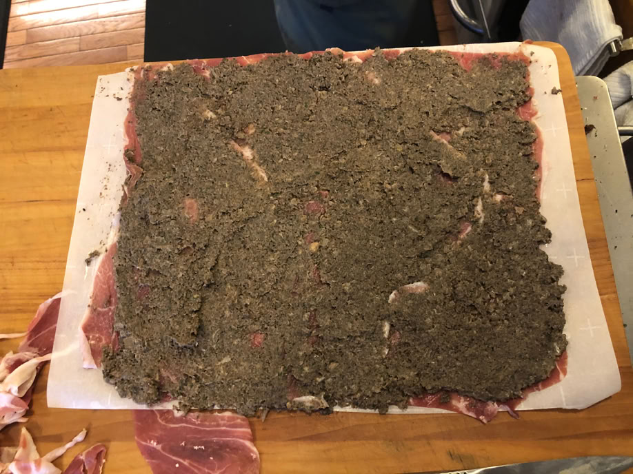 The Mushroom Duxelles are now spread out into a thin layer on top of the prosciutto.