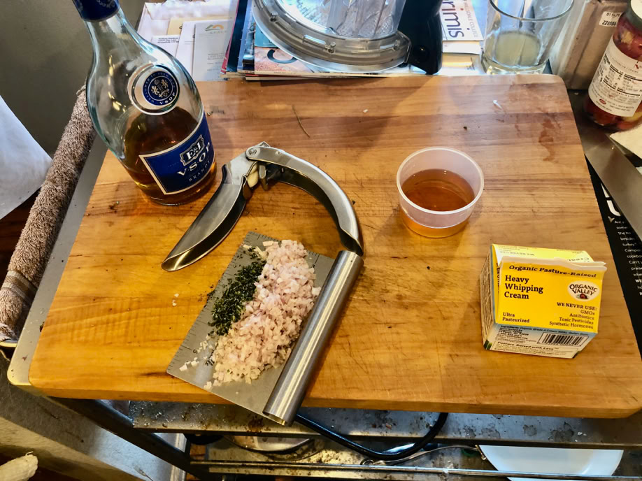 The rest of the Mise en Place. The brandy is measured in the small plastic cup, the thyme and shallots are on the bench scraper and the cream goes in at the end.