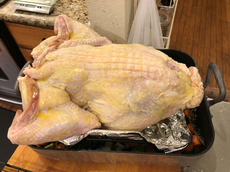 The turkey bakes breast side up for the first 45 minutes. The mirepoix is in the pan and it’s into the oven at 5:12 pm, still pretty close to the timeline!
