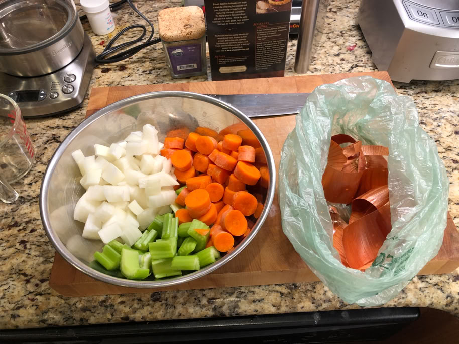 For the roasting pan, Cook’s Illustrated modifies the mirepoix to be equal parts onions, carrots and celery. We’re starting to collect onion skins for next week’s turkey stock. They give the stock a rich dark color and add a bit of flavor.