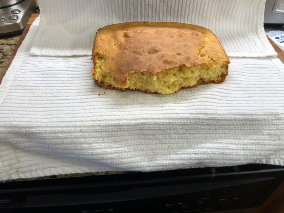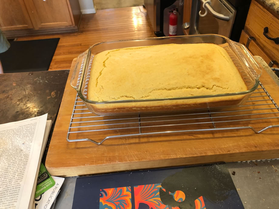 A bit of a side track. The corn bread for the stuffing isn’t on the time line, since it can be prepared ahead of time. This time we had a bit of a problem. We tried to do a half batch on Wednesday and it didn’t rise properly. We think that’s because we didn’t use a small enough pan and the corn meal batter was so thin that it started setting up before the baking powder had a chance to properly rise the cornmeal. So, Thursday morning, we did our usual double batch and it rose properly.