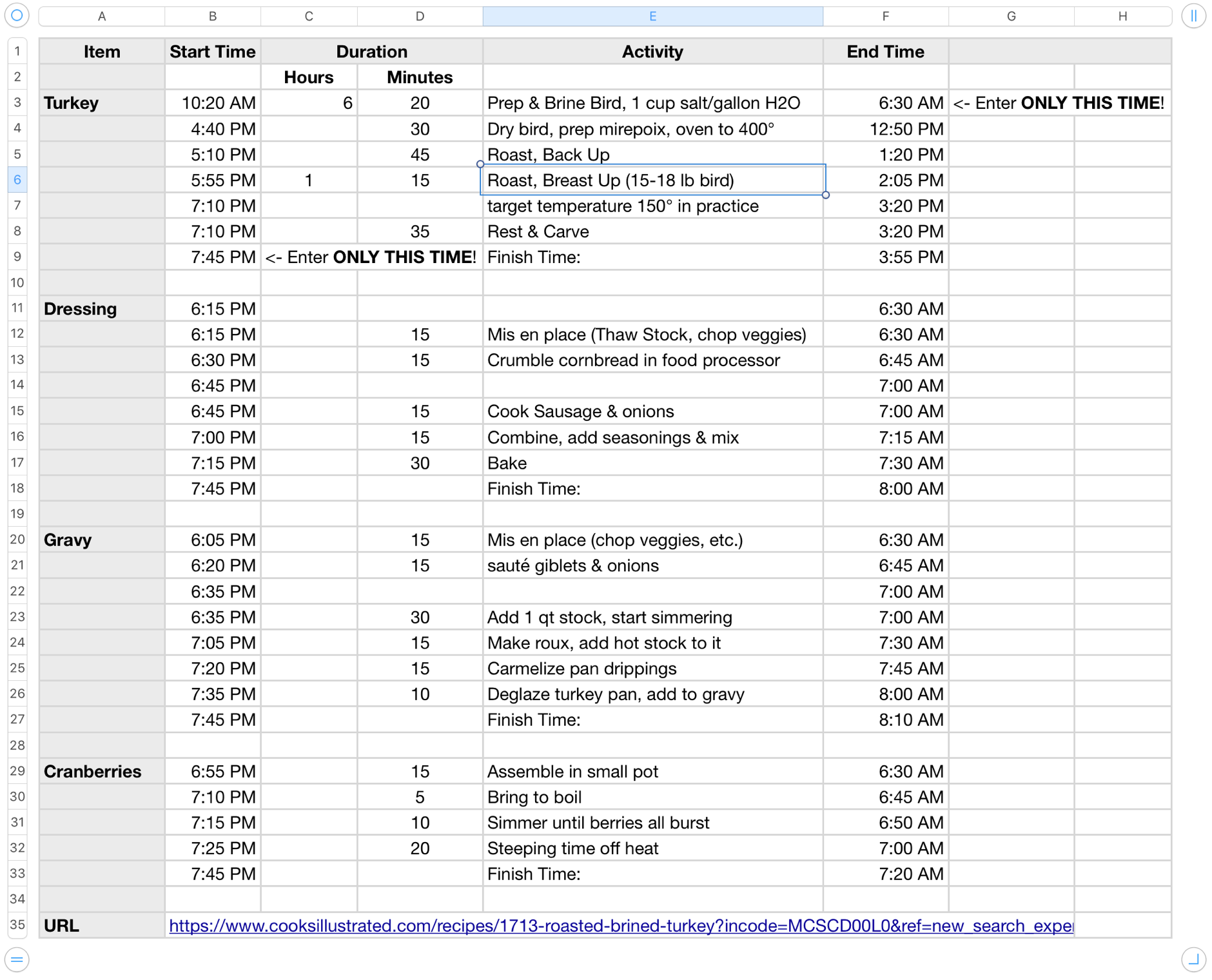 We use a spreadsheet to finagle everything into the correct order. The above is what would happen if we did everything on Thanksgiving. This time we got the turkey a few days early, so we brined it on Wednesday evening and let it dry in the refrigerator overnight. This produces a more crispy skin. Thus today’s timeline actually starts at 4:40 PM, with just prepping the mirepoix and preheating the oven being necessary.