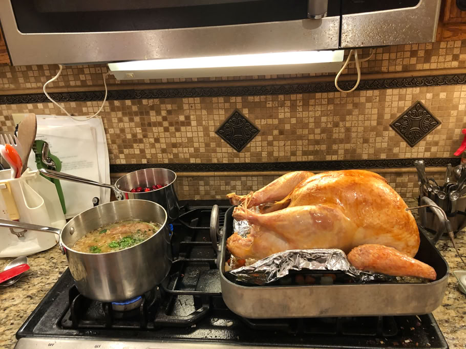 The temperature alarm went off at 7:17 PM, so we’re getting a bit behind the timeline. The stock for the dressing is simmering on the left hand burner.
