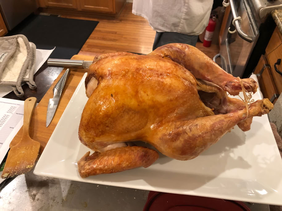 The turkey is flipped onto it’s back to finish roasting.