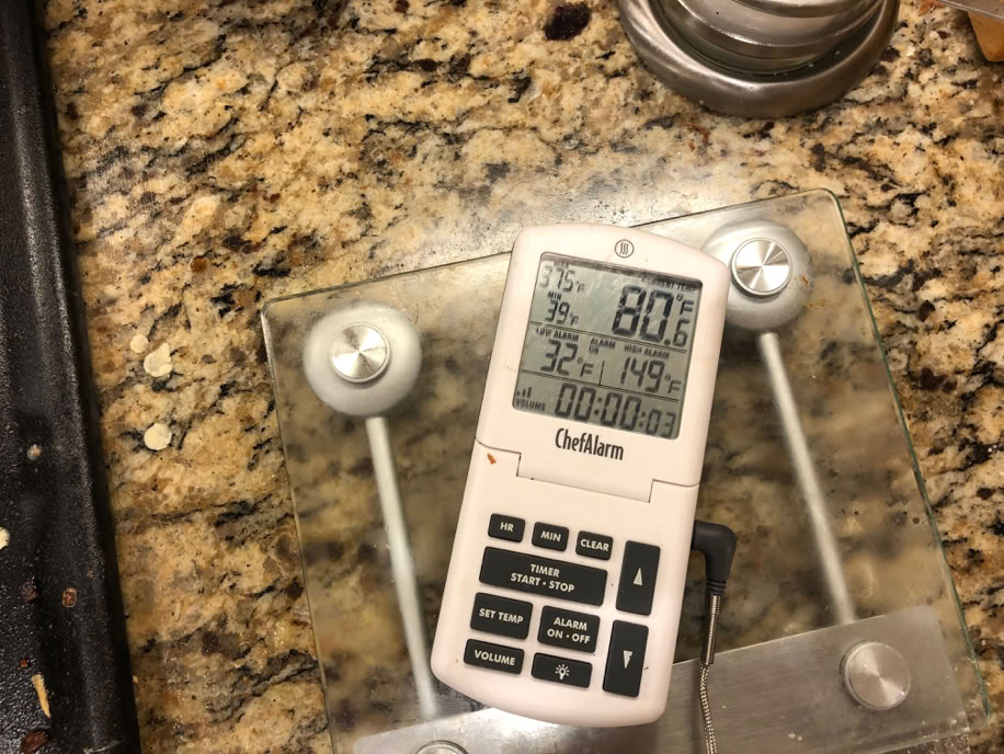 Sigh, the probe was set a bit too close to the bone. When we started pulling it out, it went down to 142, so it was back into the oven for a while. As Bullwinkle would say - “This time for sure!”