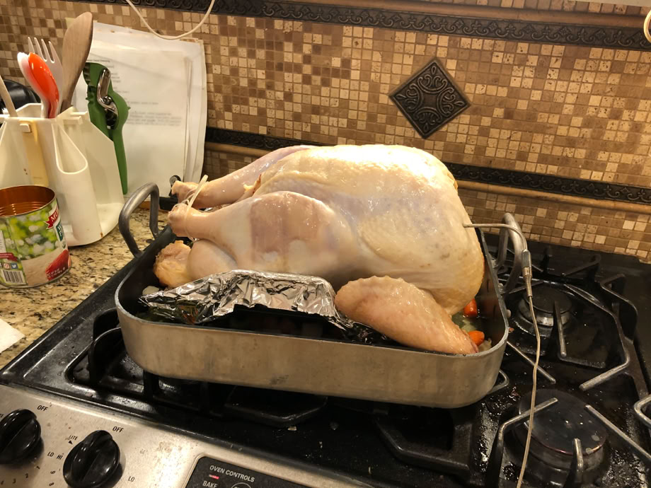 Then the temperature probe is inserted into the center (we hope!) of the breast. After the 1st 45 minutes in the oven, it’s at only 80°F. The alarm is set for 149°F, which gives us some time to pull the bird out of the oven. This is a big bird so it will coast up to the finish temperature of 155 - 160°F