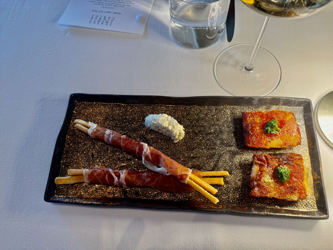 Yep, there are two appetizers. The one on the left they call “Slim Jims”. They are prosciutto wrapped around small bread sticks. The one on the right is the Frico Caldo with parsley vinaigrette.