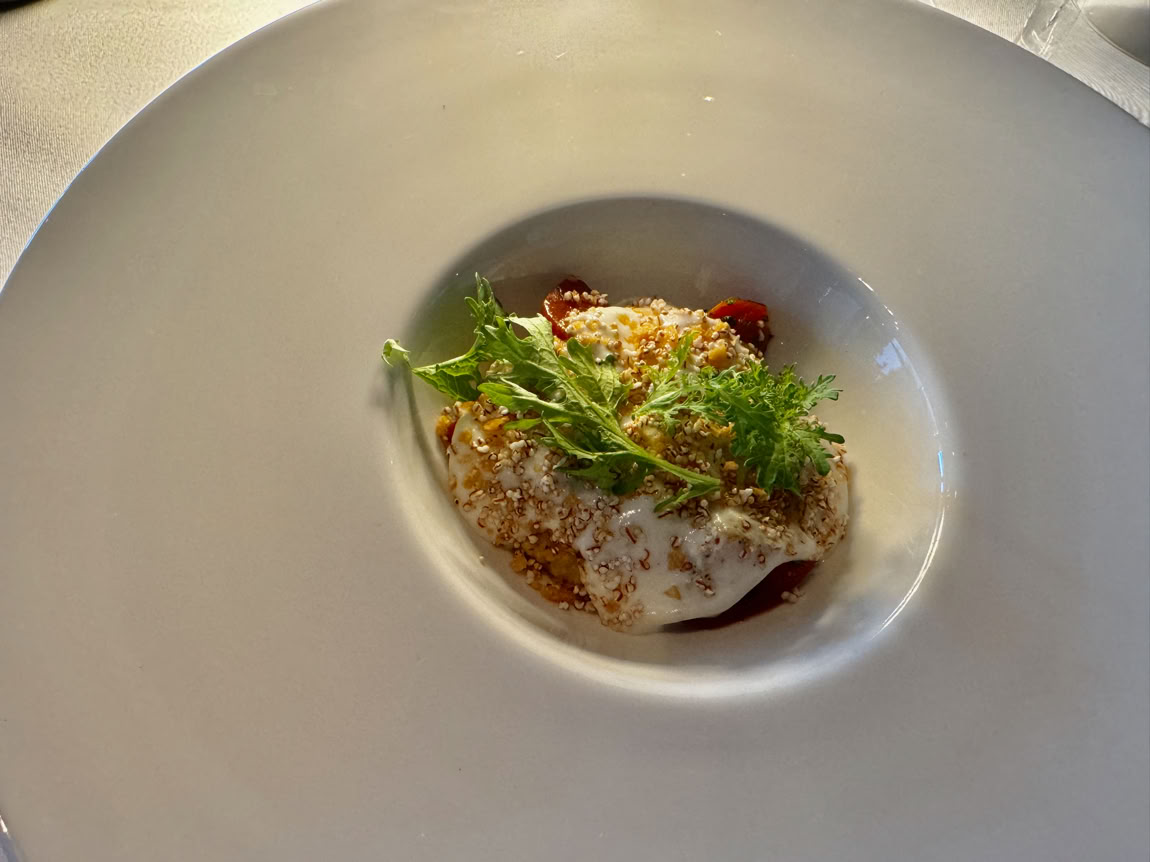 This was quite the surprise! The badger flame beets are sweeter and less earthy than regular beets and we liked these. There is polenta and a whipped cheese topping with rosemary seeds and mustard greens.