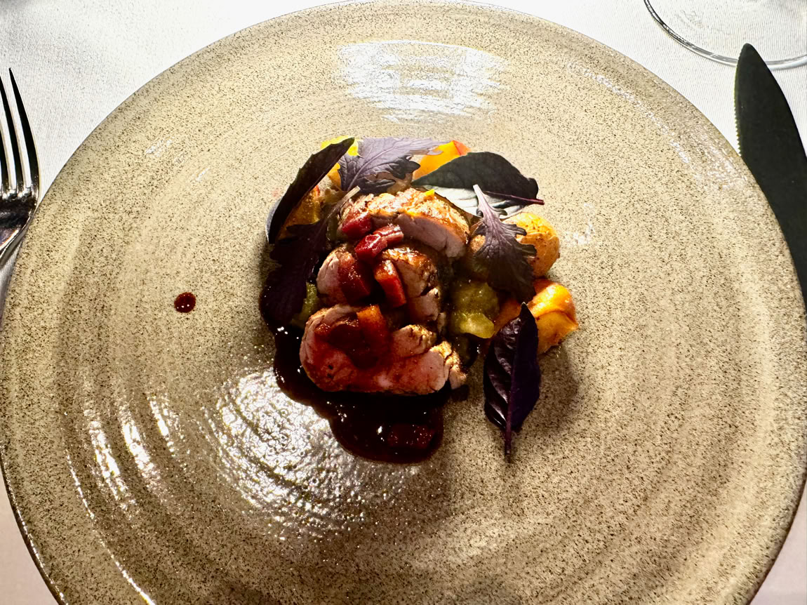 Rasato is a Berkshire heritage tenderloin. The pork tenderloin is amazingly tender and flavorful. Peaches are just an amazing contrast to the rich earthy pork and they were really roasted and came to table hot. The Yukon potatoes are amazingly bright and fresh. There are tiny little olive pieces preserved with lemon in the Yukon potatoes.