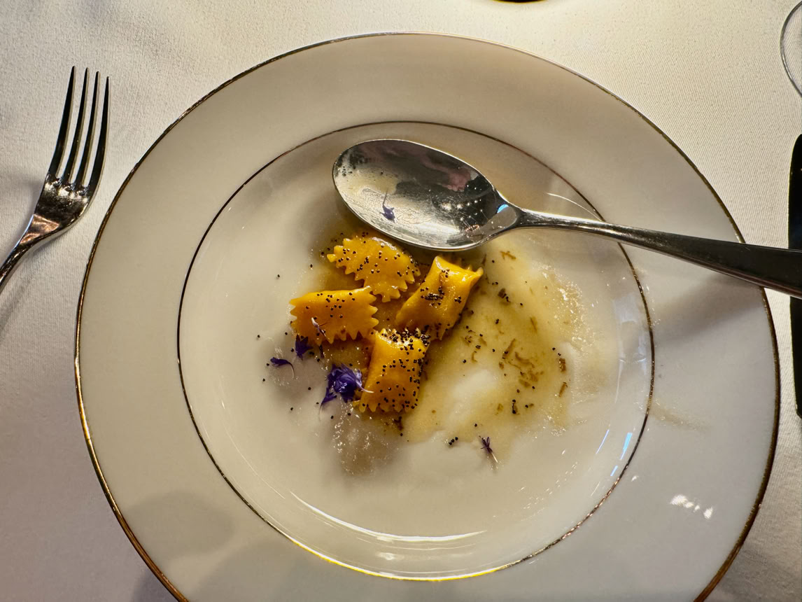 Agnilotto corn stuffed pasta, butter sauce, topped with spec. The pasta is the smallest stuffed pasta we’ve ever seen. You definitely want to use a spoon with this dish to get every bit of that butter sauce. That Martin didn’t get the shot until several of the little pastas were gone.