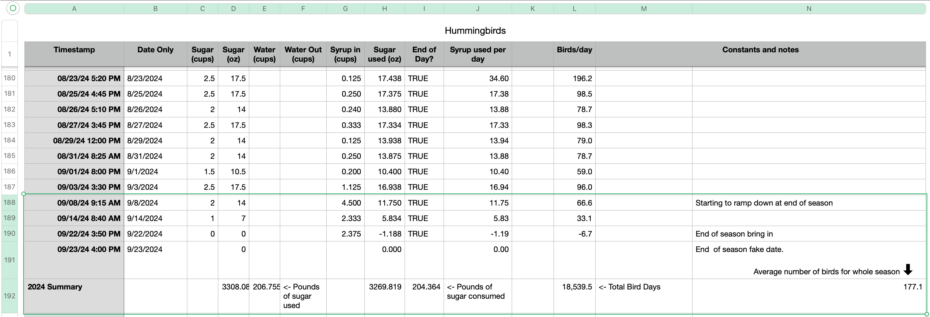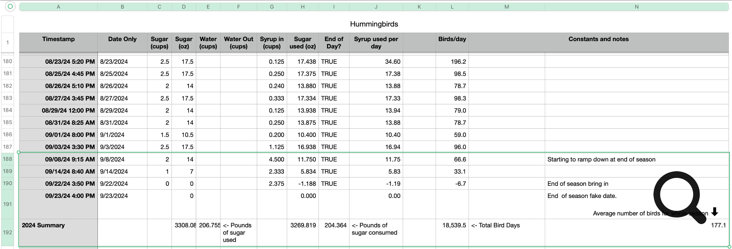 Just over 200 pounds of suger was used this season, for a total of 18,539 Hummingbird Days. Over the whole season we averaged 177 birds per day.