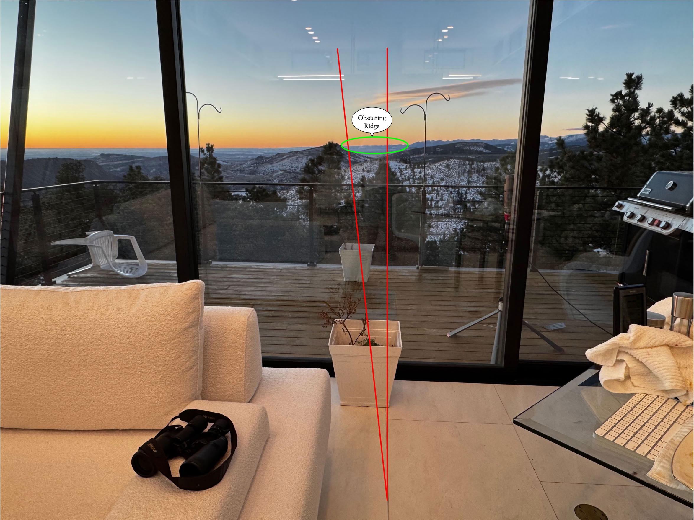 So, flipping the lines from the map and placing the due south line on the tile band Martin carefully lined the camera up with, we can’t see any peak??