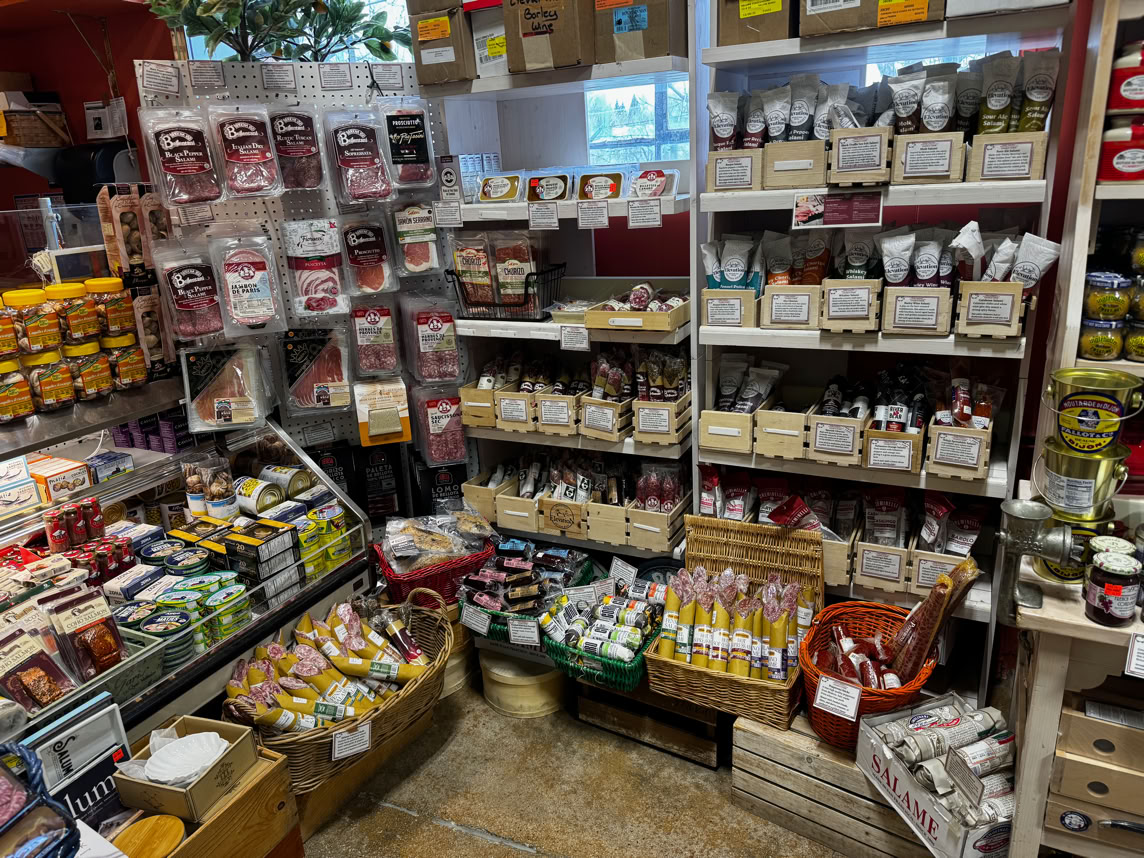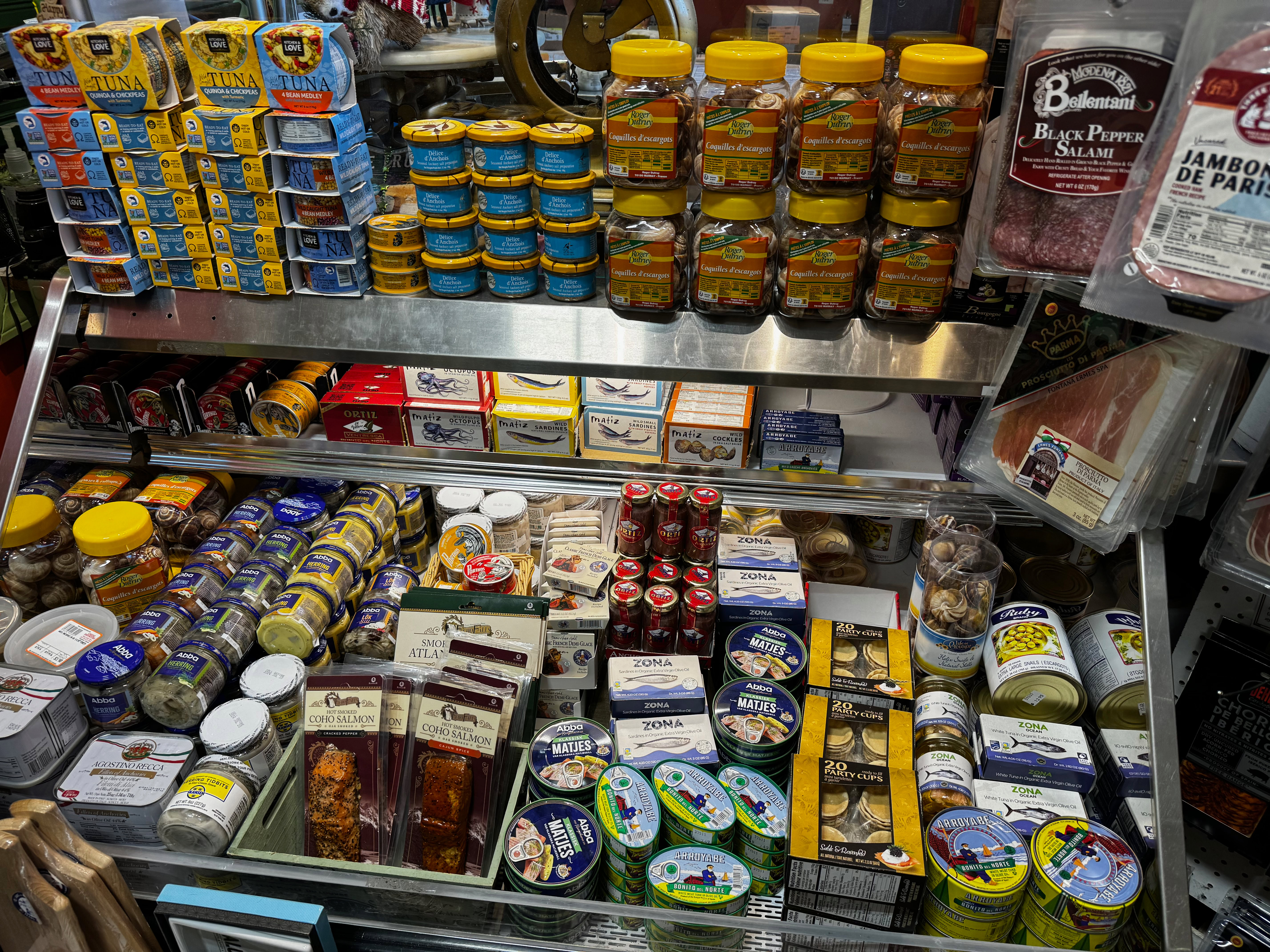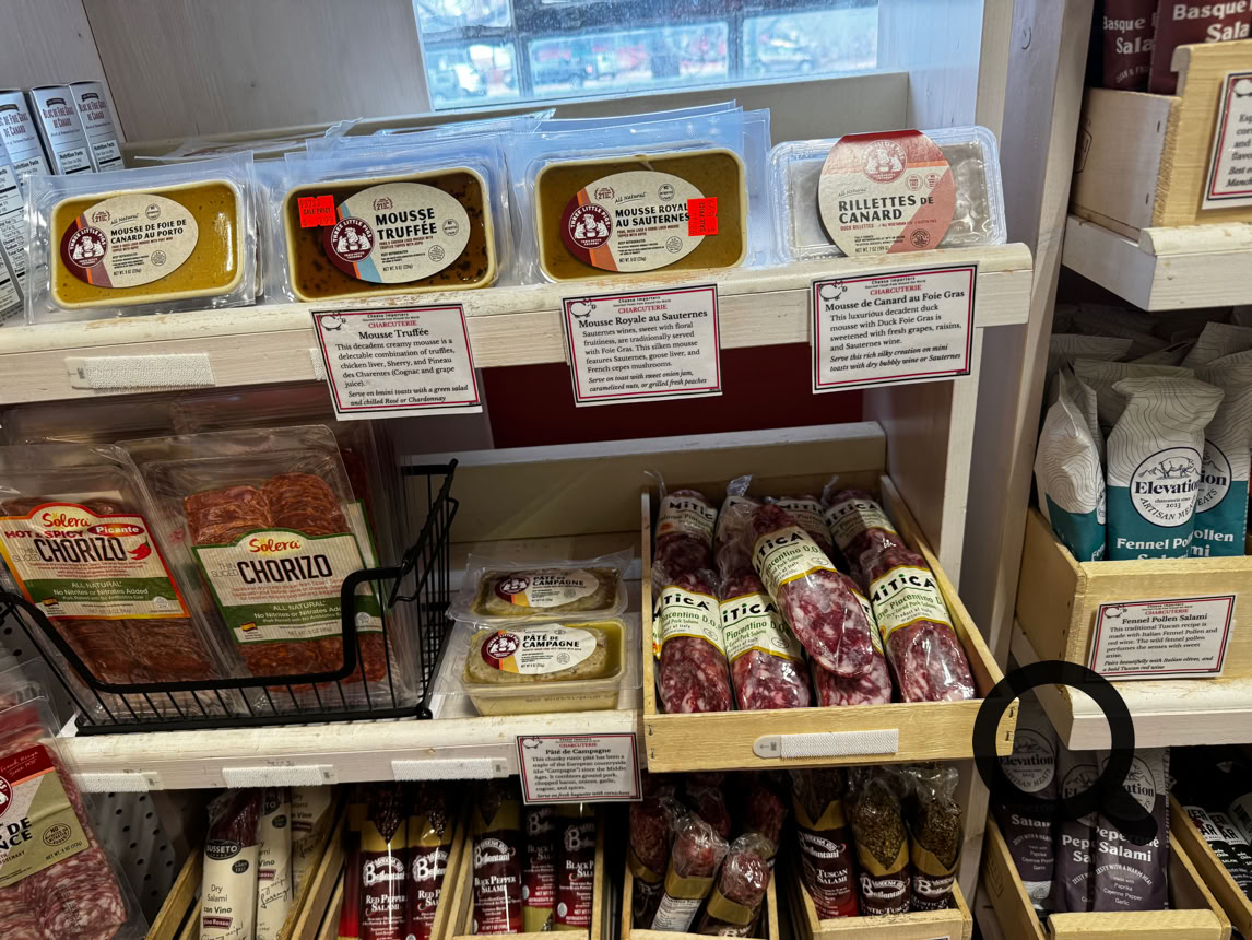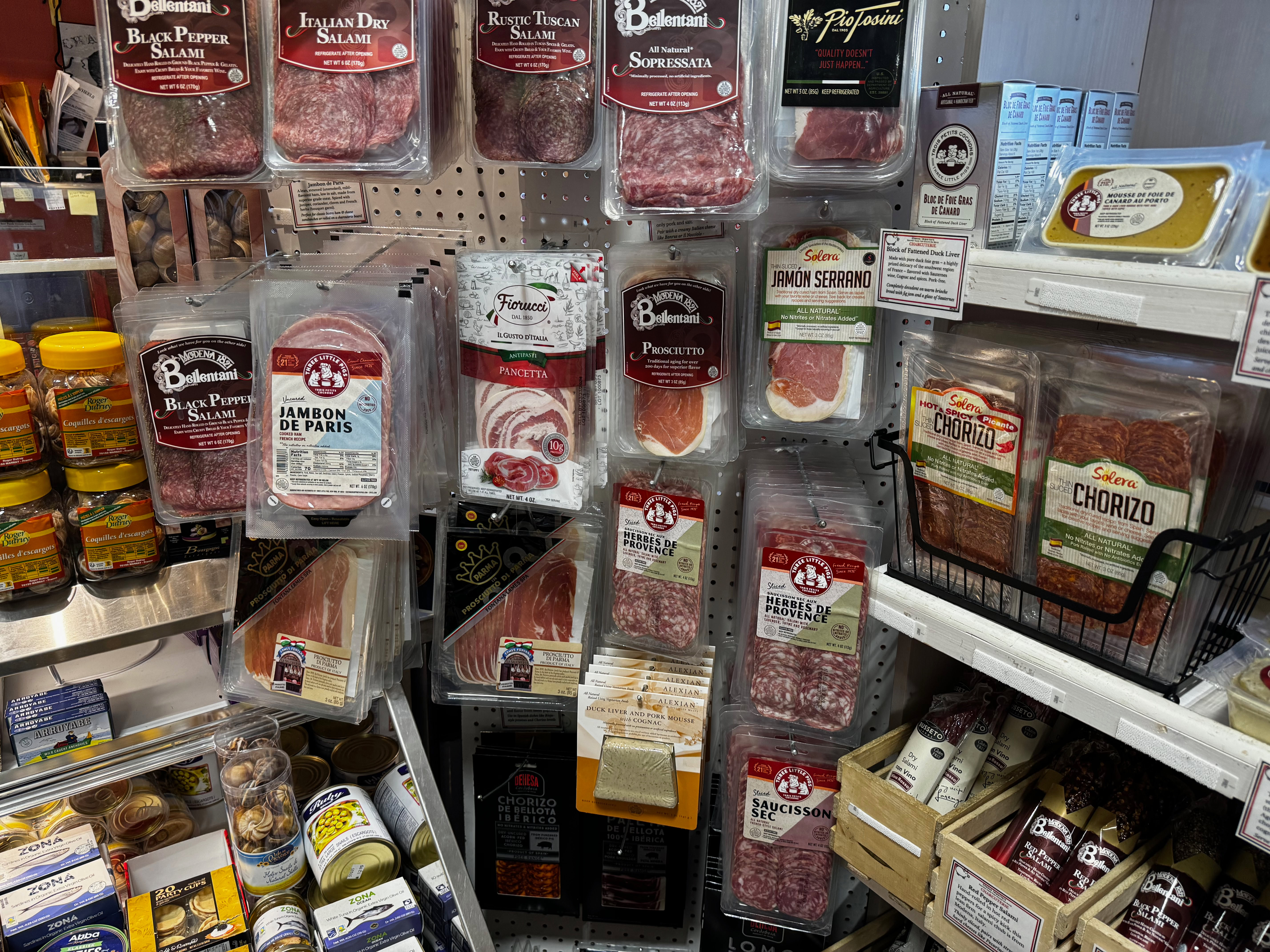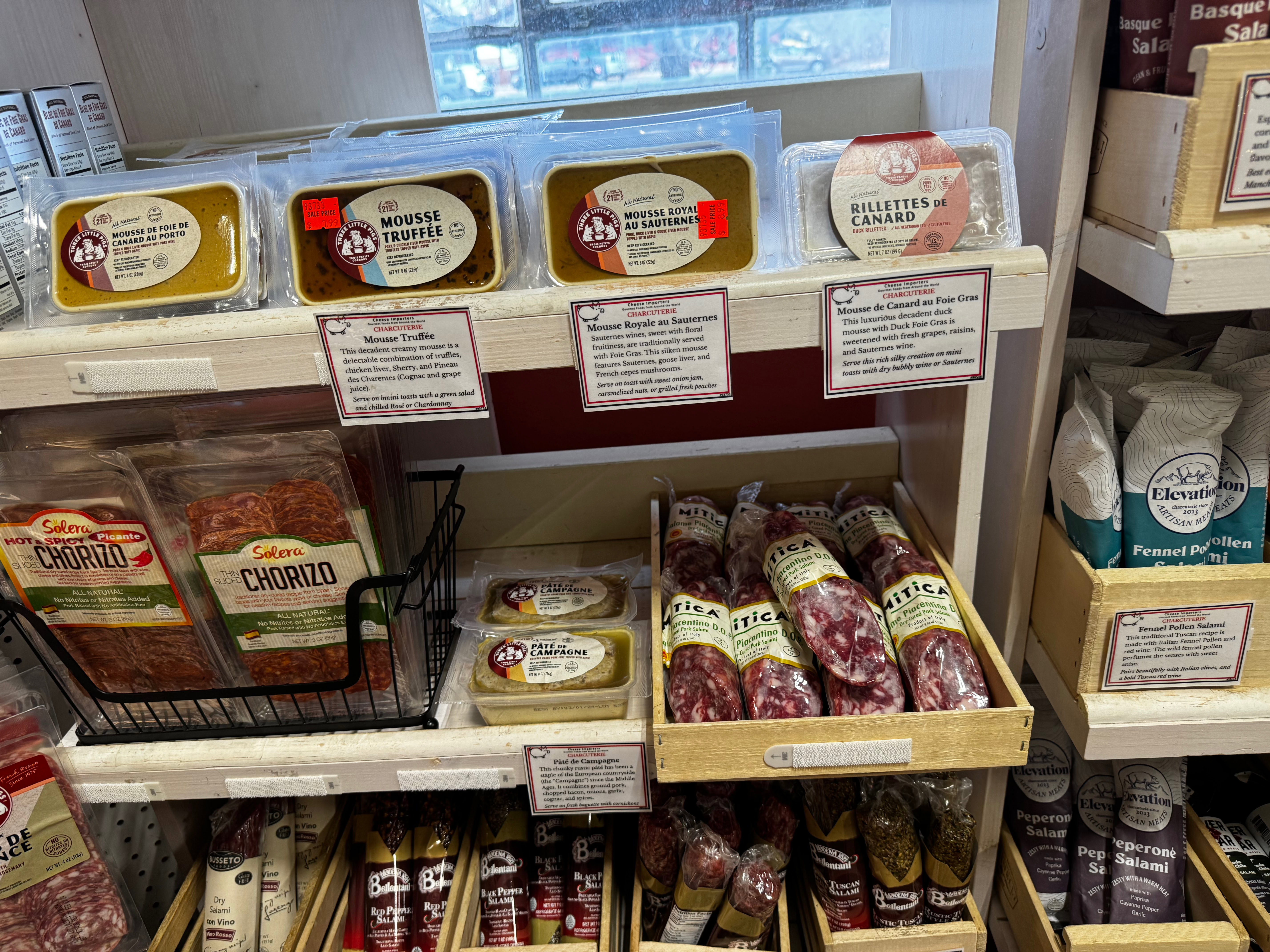 This is just to the right of the case. In the middle is a wide variety of charcuterie and the sign on the shelf in front of the silver boxes at the top left of the shelves says: