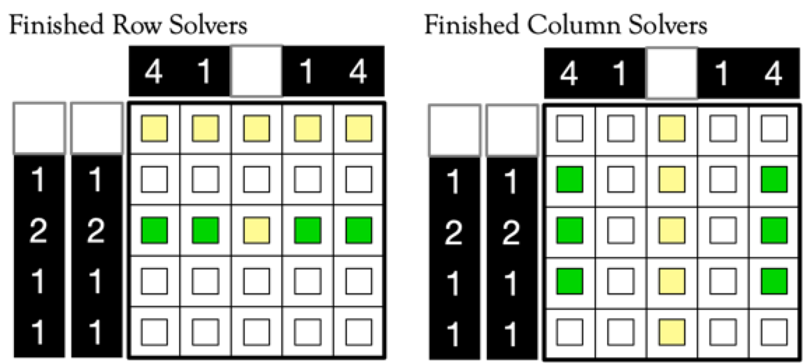 If a cell is solved by either a row or column solver, it’s marked as solved. If there are conflicts, the board can’t be solved by this algorithm and is likely unsolvable without guessing.