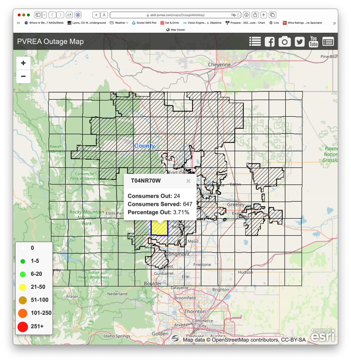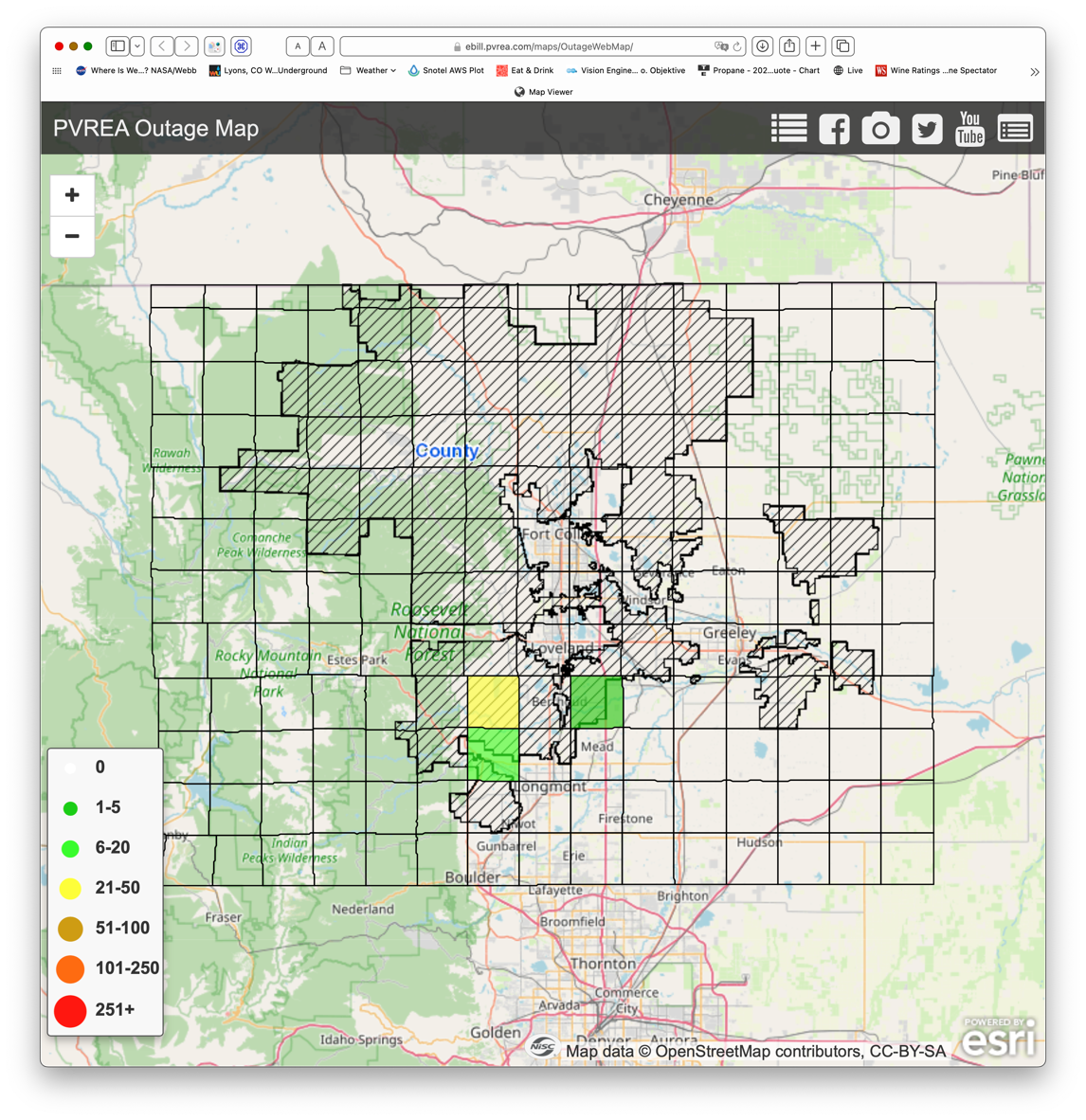 Poudre Valley REA’s outage map. It’s just us, so we don’t know whether power will be back on very quickly or very slowly.