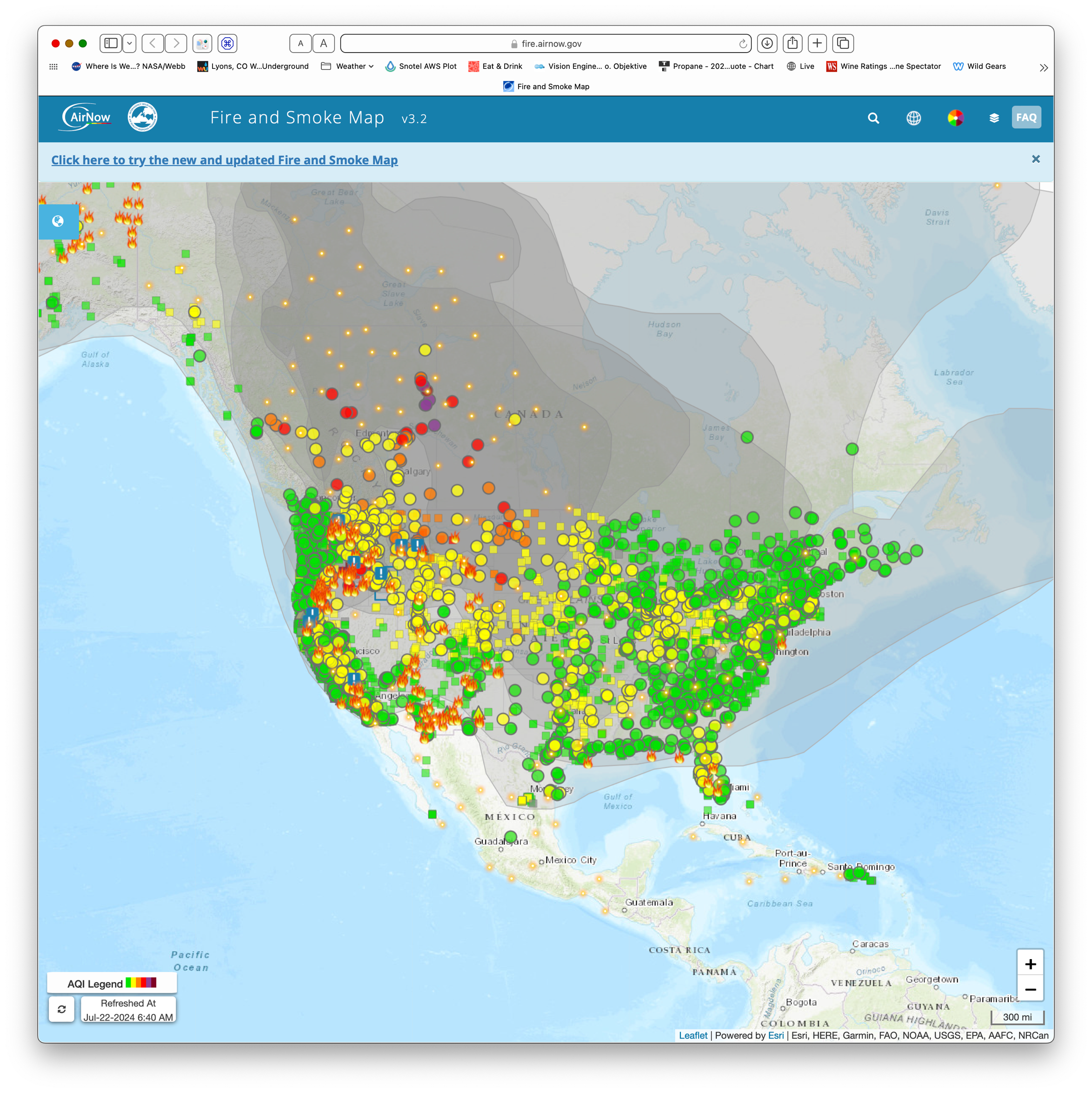 They’ve changed this a bit from last year, you can’t select what size fires to look at, but its roughly comparable. This is from https://firms.modaps.eosdis.nasa.gov/usfs/map/#d:24hrs;@-82.3,40.4,4.0z. This is definitely different from last year. This time the fires are simultanously burning from Newfoundland to Alaska. They aren’t progressing from east to west like they did last year.