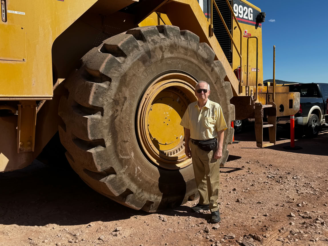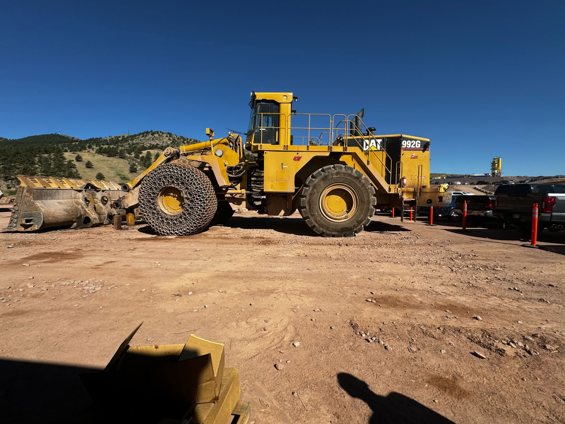 This is a Caterpillar 992G front end loader ( https://www.cat.com/en_US/products/new/equipment/wheel-loaders/large-wheel-loaders/108700.html ). That is 230,000 pounds of machine. When you are building a dam that will have 12 million cubic yards of rock in it, you need truly large machines! It’s working in hard rock, so they put chains on the front tires to keep them from being chewed up too fast.