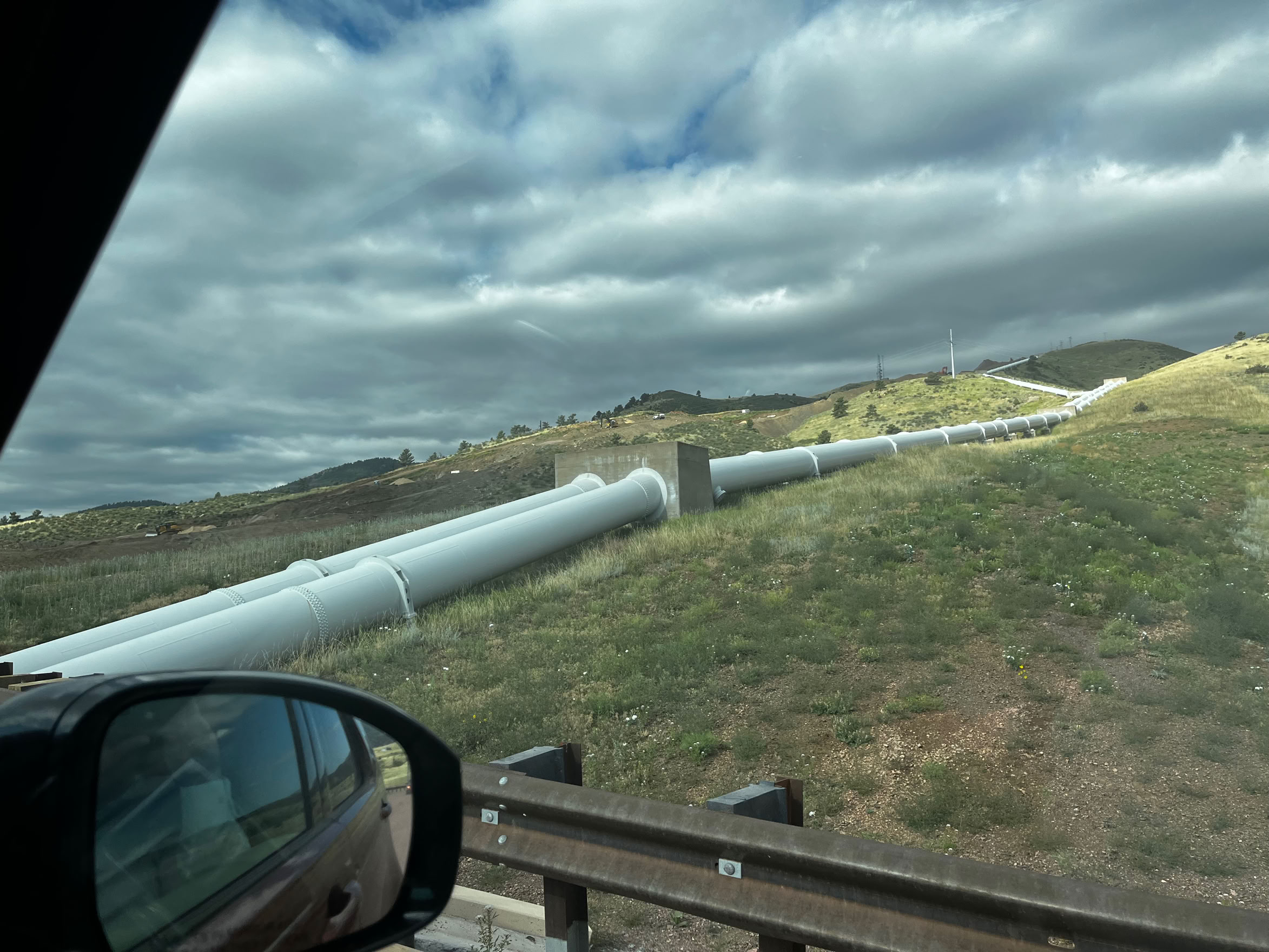 This was actually taken on the last community day, August 13, 2023. These are the existing penstocks that take the water from the end of the aqueduct across the Continental Divide down to the Flatirons powerplant. This is part of the Big Thompson project. The first surveys for the project were done in 1884 ( https://www.northernwater.org/about-us/history ). The new penstock is completely underground, to the left of these two. The project had always been planned to have Carter Lake and Chimney Hollow reservoirs, but they ran out of money. So, over a century later, the reservoir is being constructed. Did we mention that civil engineers have to be very patient?!!