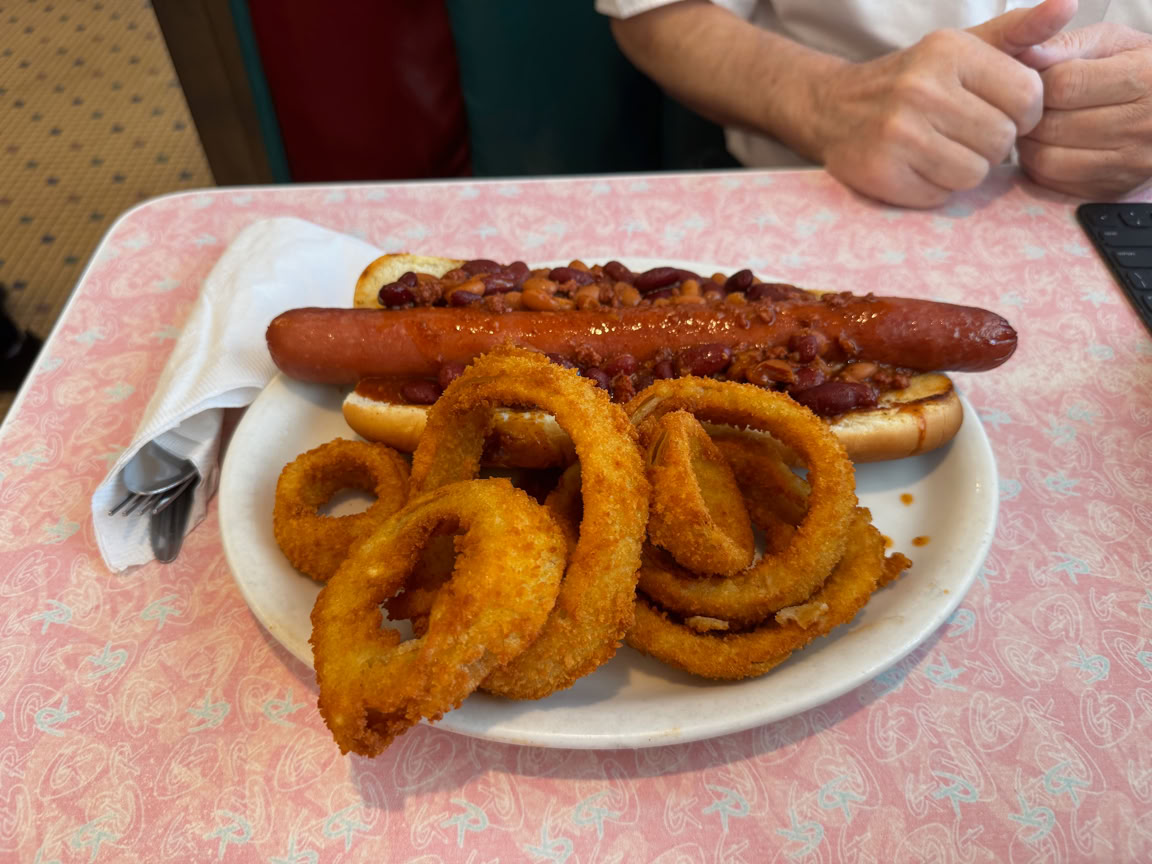 Bills Foot Long Hot Dog and Onion Rings. If you look closely you can see that the table pattern is Rosie’s logo.