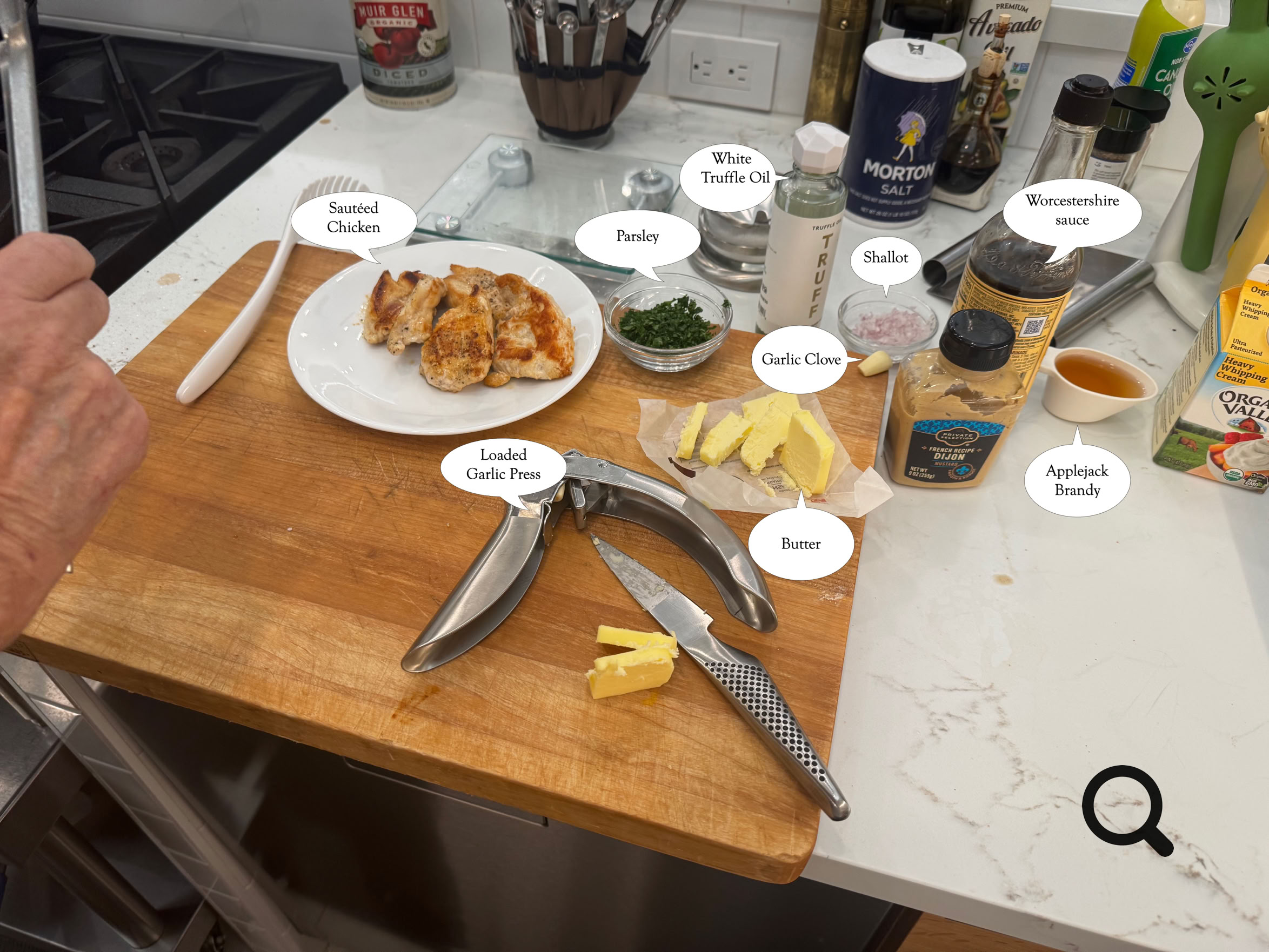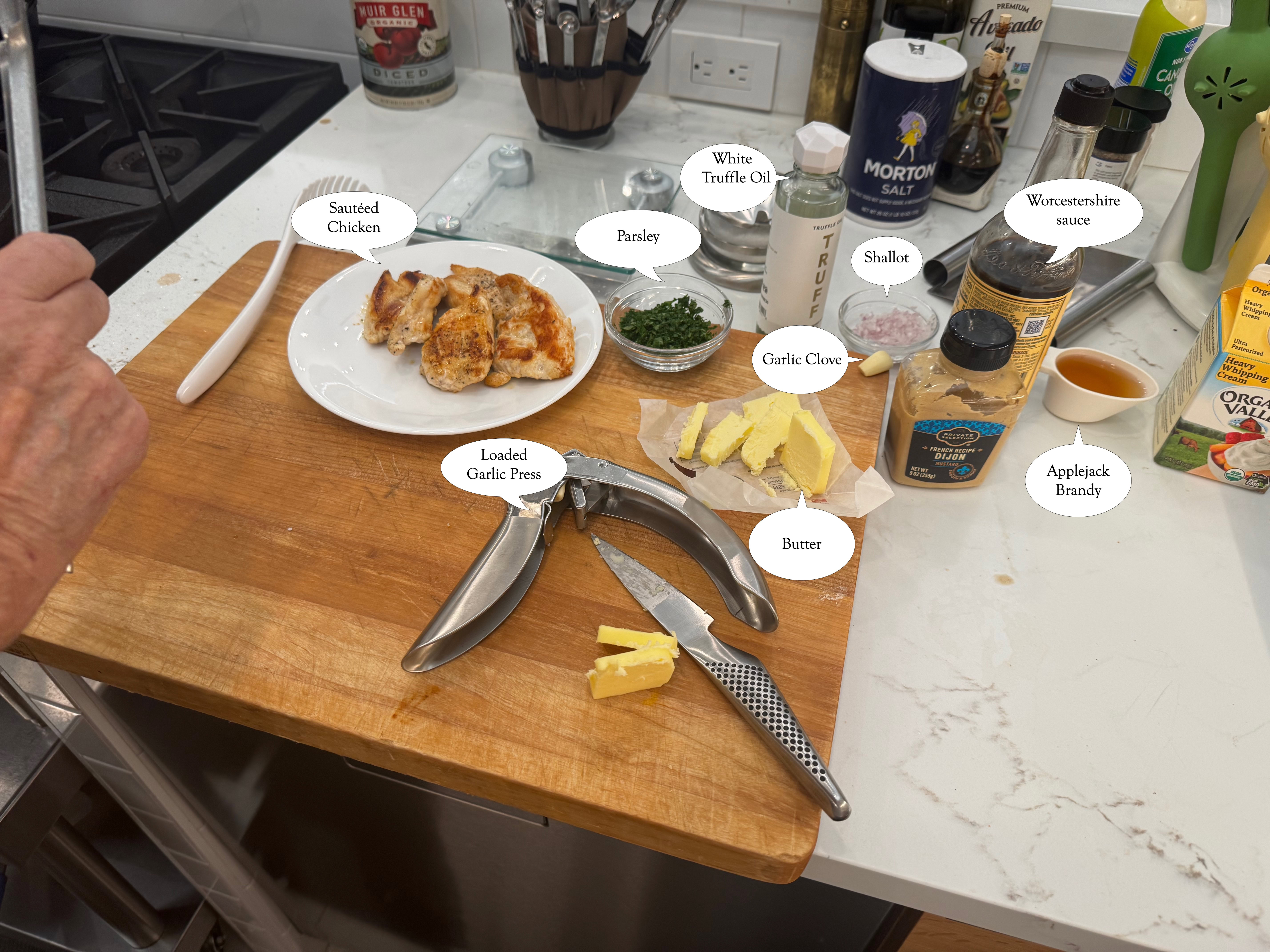 The parsley gets used in both the chicken and the truffled linguine. Not shown are the chopped chives for the linguine, because they’re not needed until the very end.